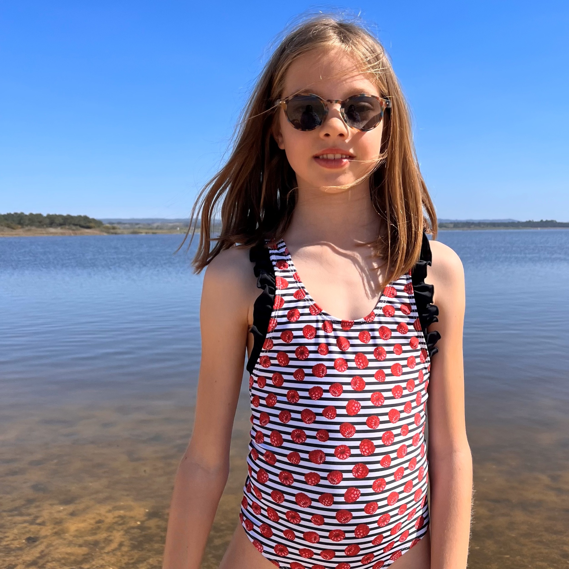 • Fato de banho infantil às riscas com bolinhas vermelhas e alças pretas, criança com óculos escuros junto à água