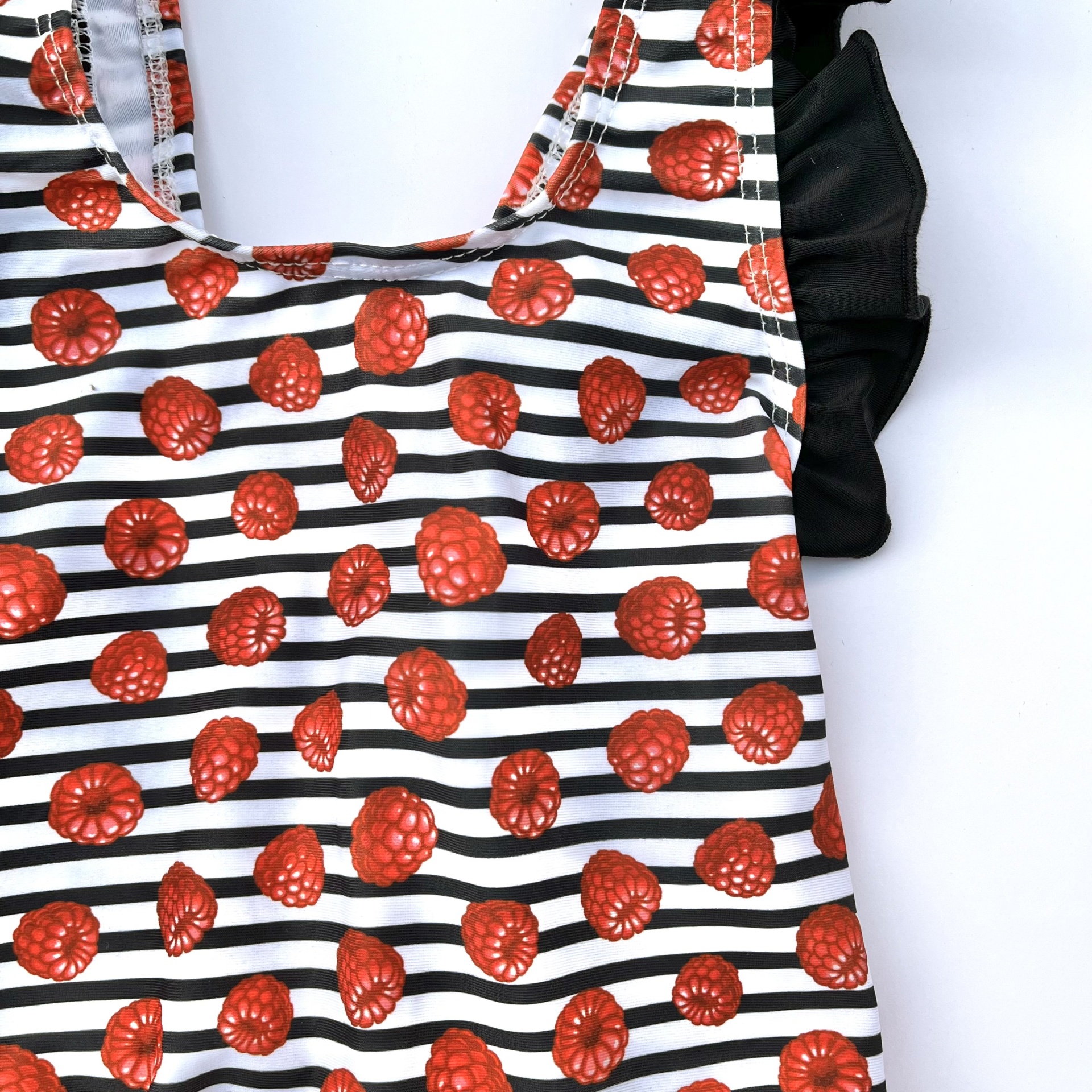 • Top ou vestido com padrão de riscas pretas e brancas e morangos vermelhos