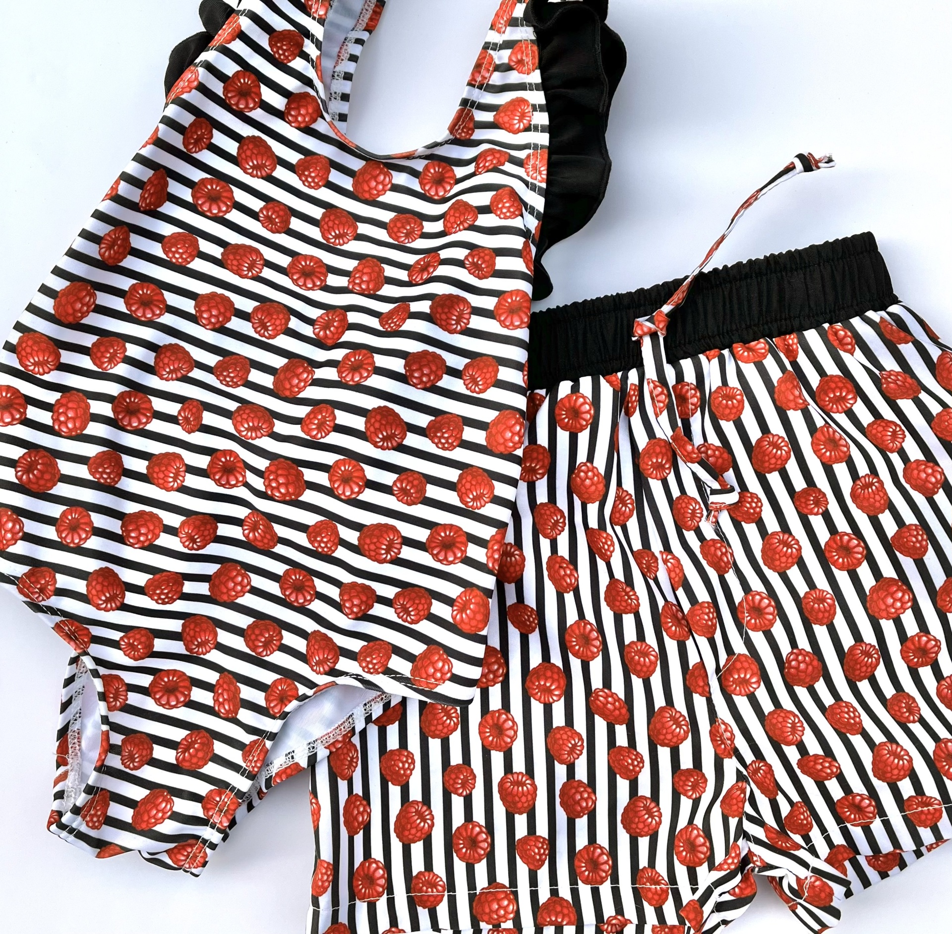 • fato de banho e calções infantis com padrão de riscas e bolas vermelhas