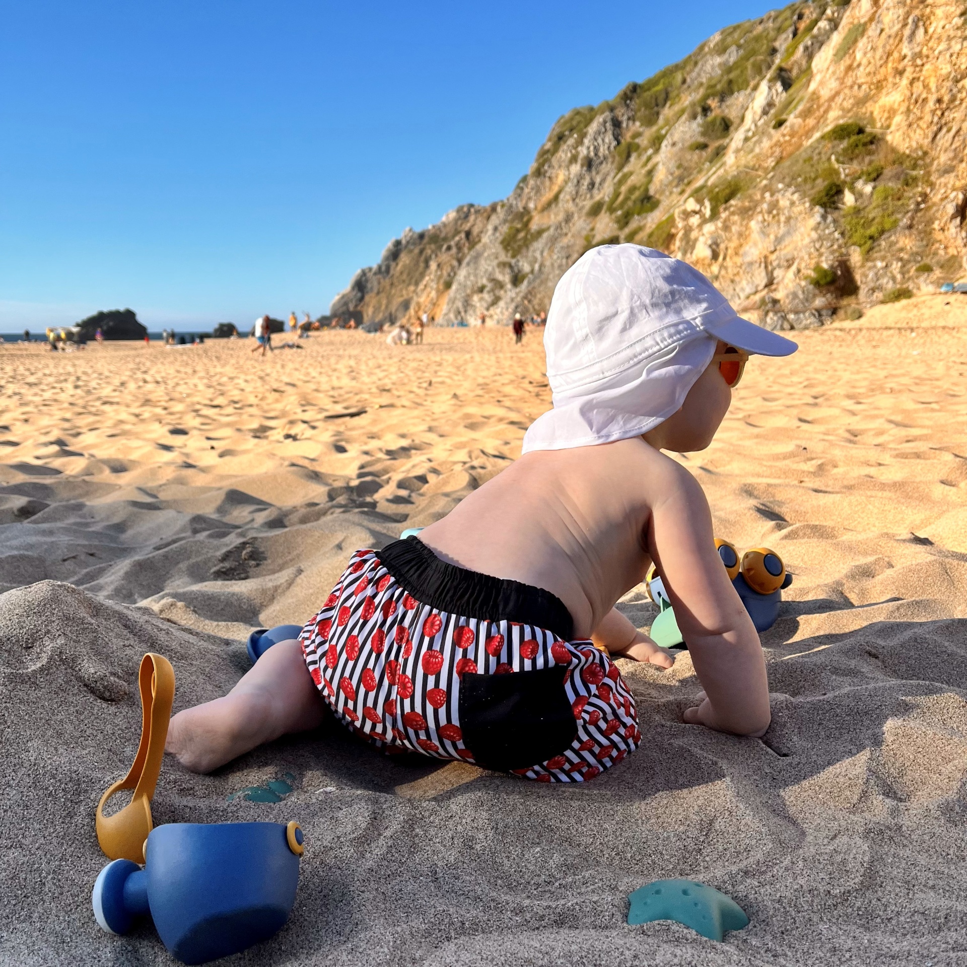 • Bebé sentado na areia da praia com chapéu e calções de banho coloridos