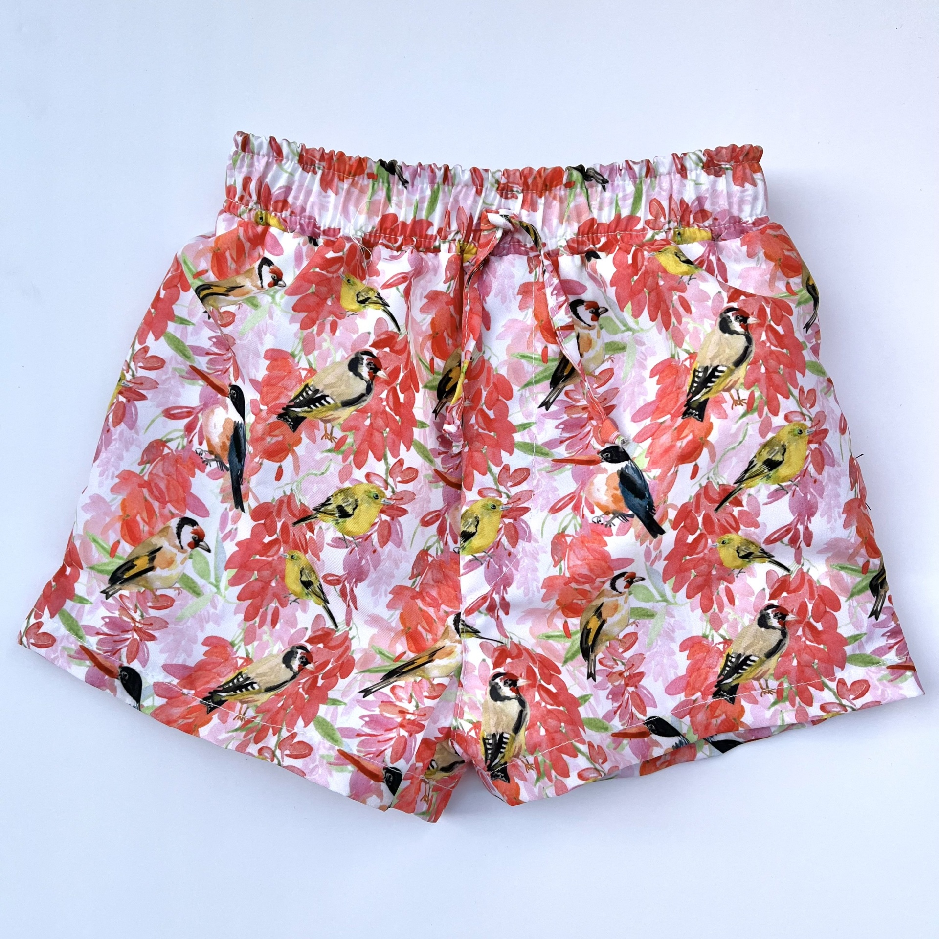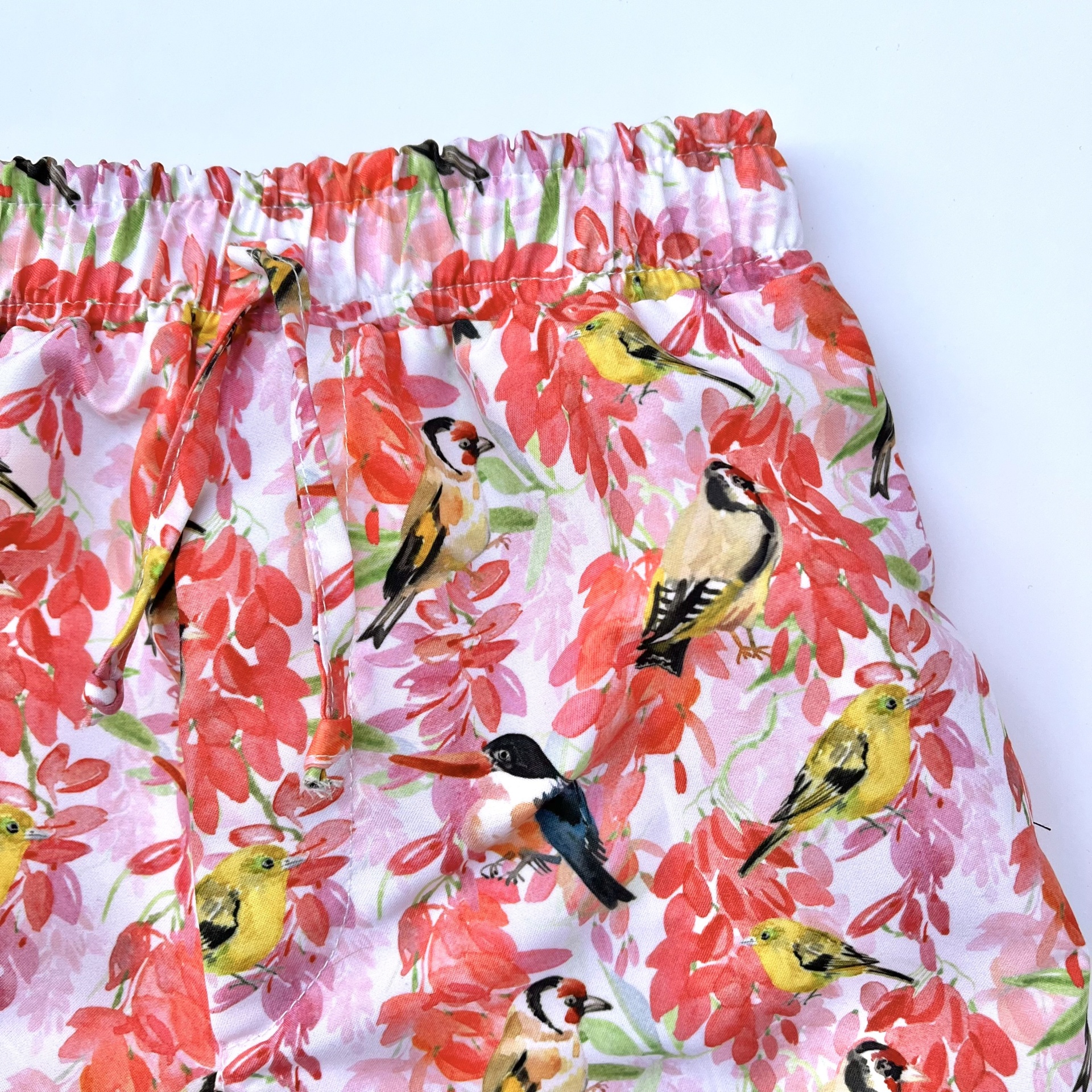 • Calções com padrão de pássaros e folhas coloridas em fundo branco