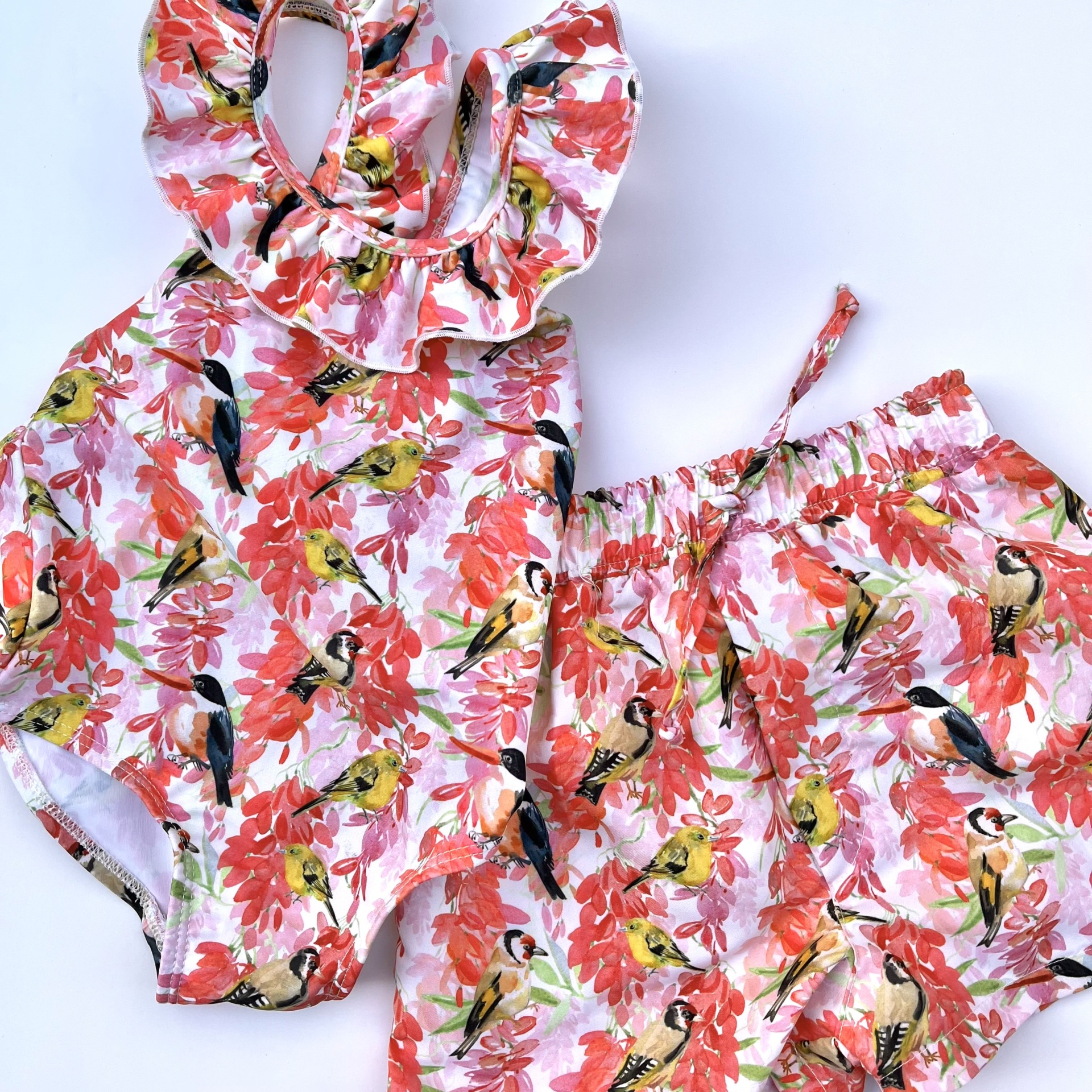 • Conjunto infantil com fato de banho e calções estampados com flores e pássaros