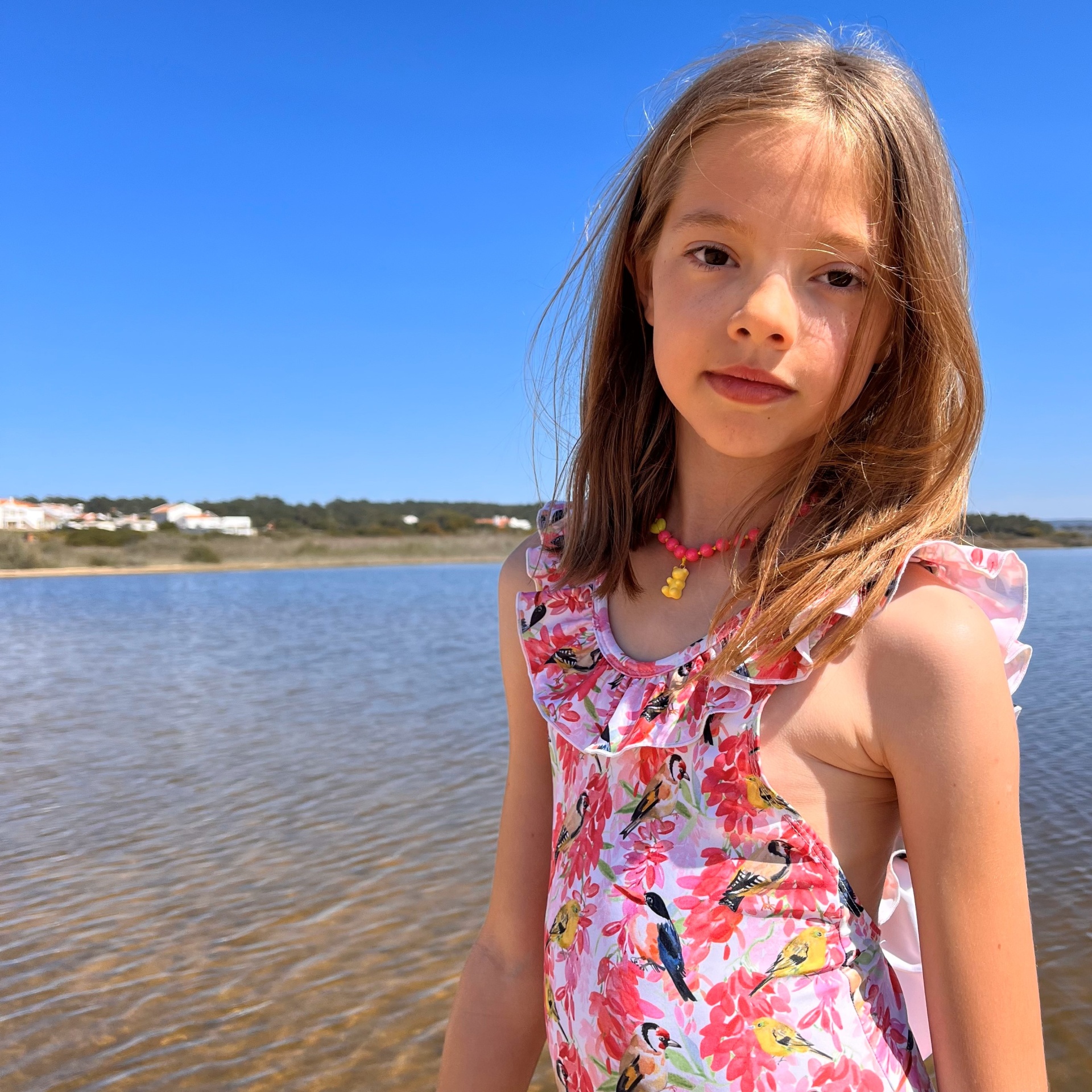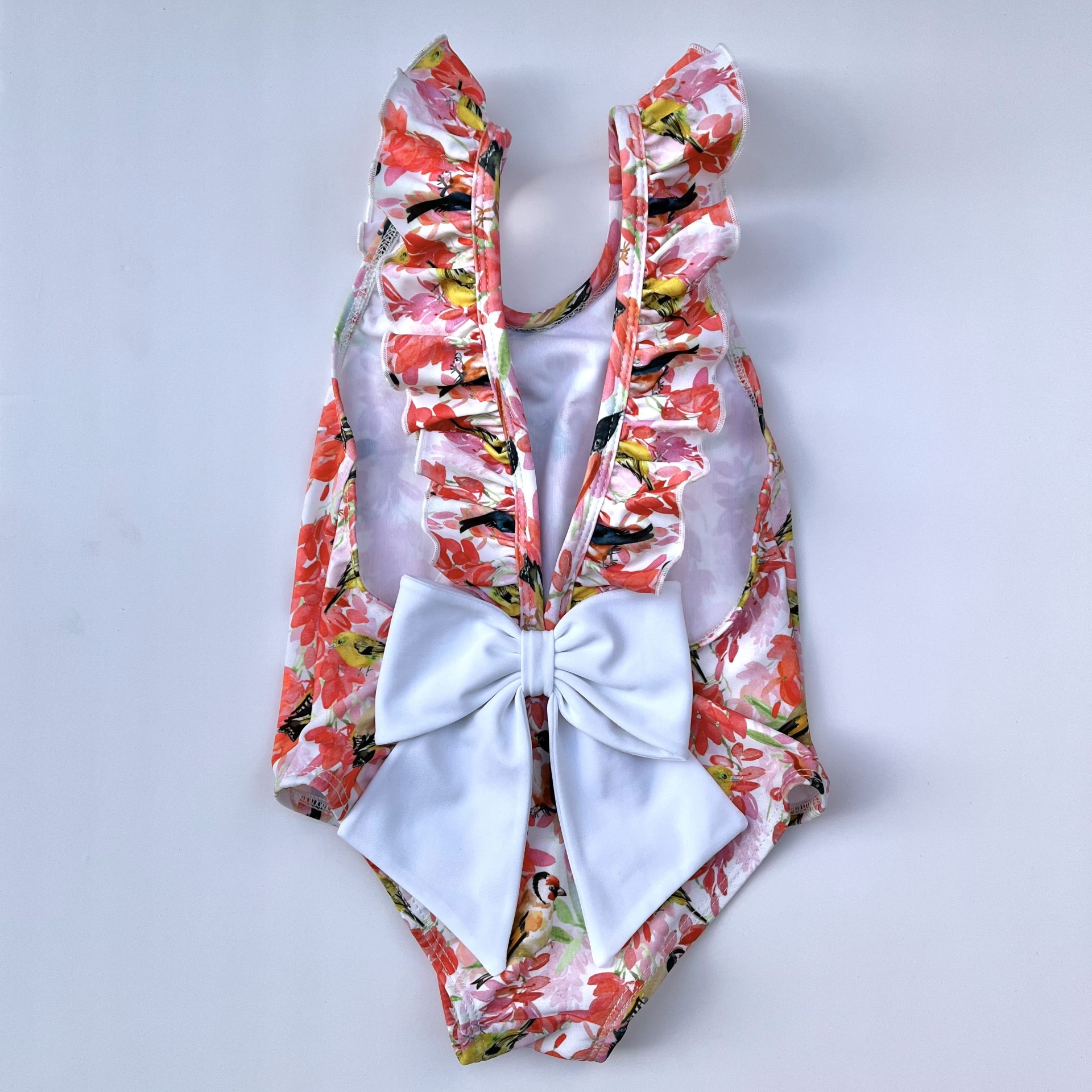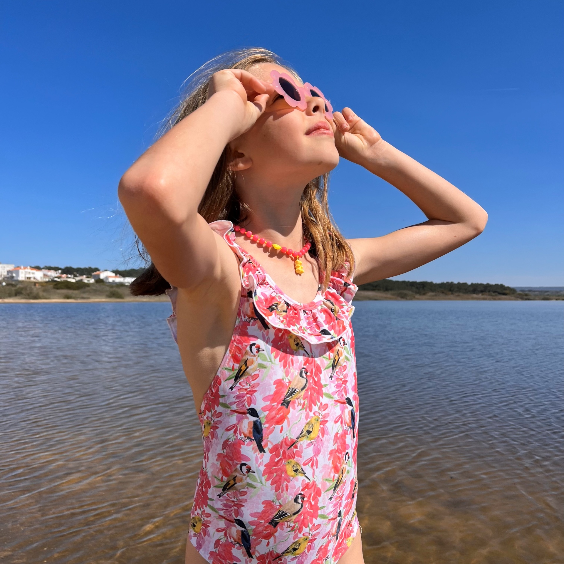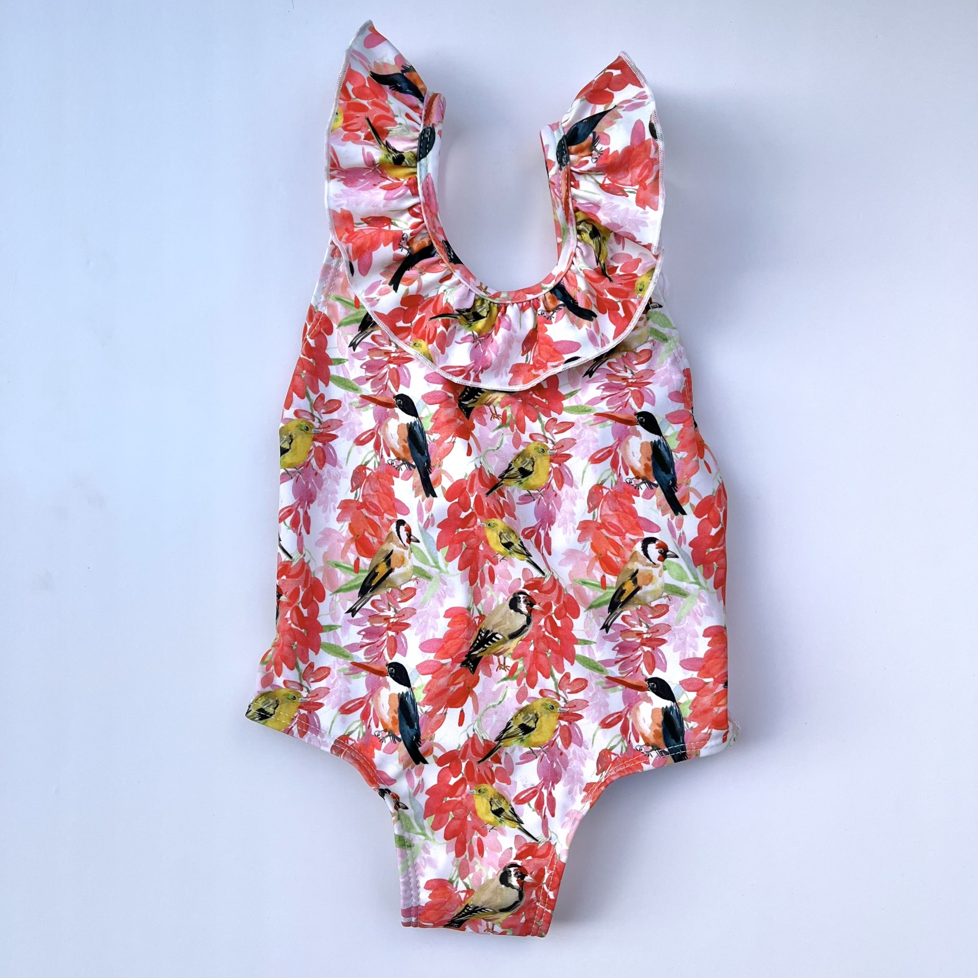 • Fato de banho infantil com estampa de pássaros e folhagem em vermelho, rosa e verde, folho no decote