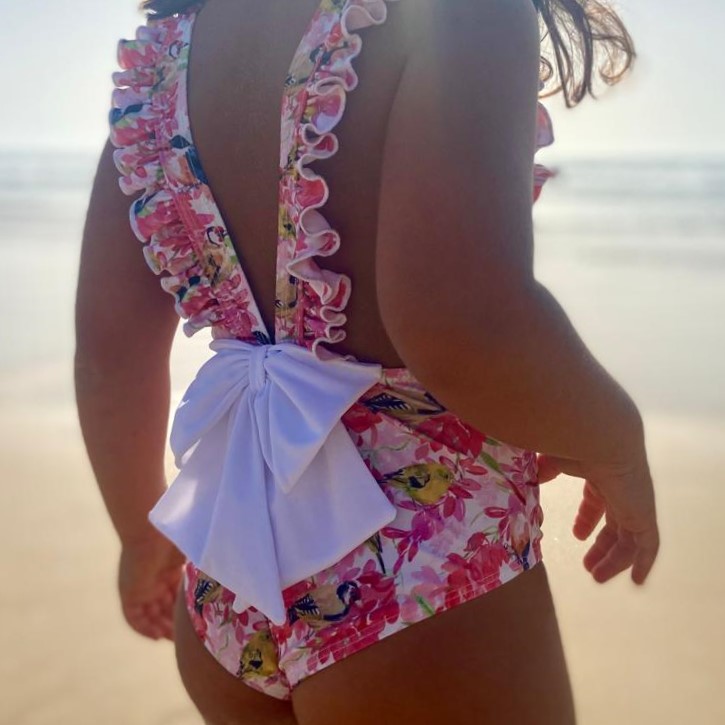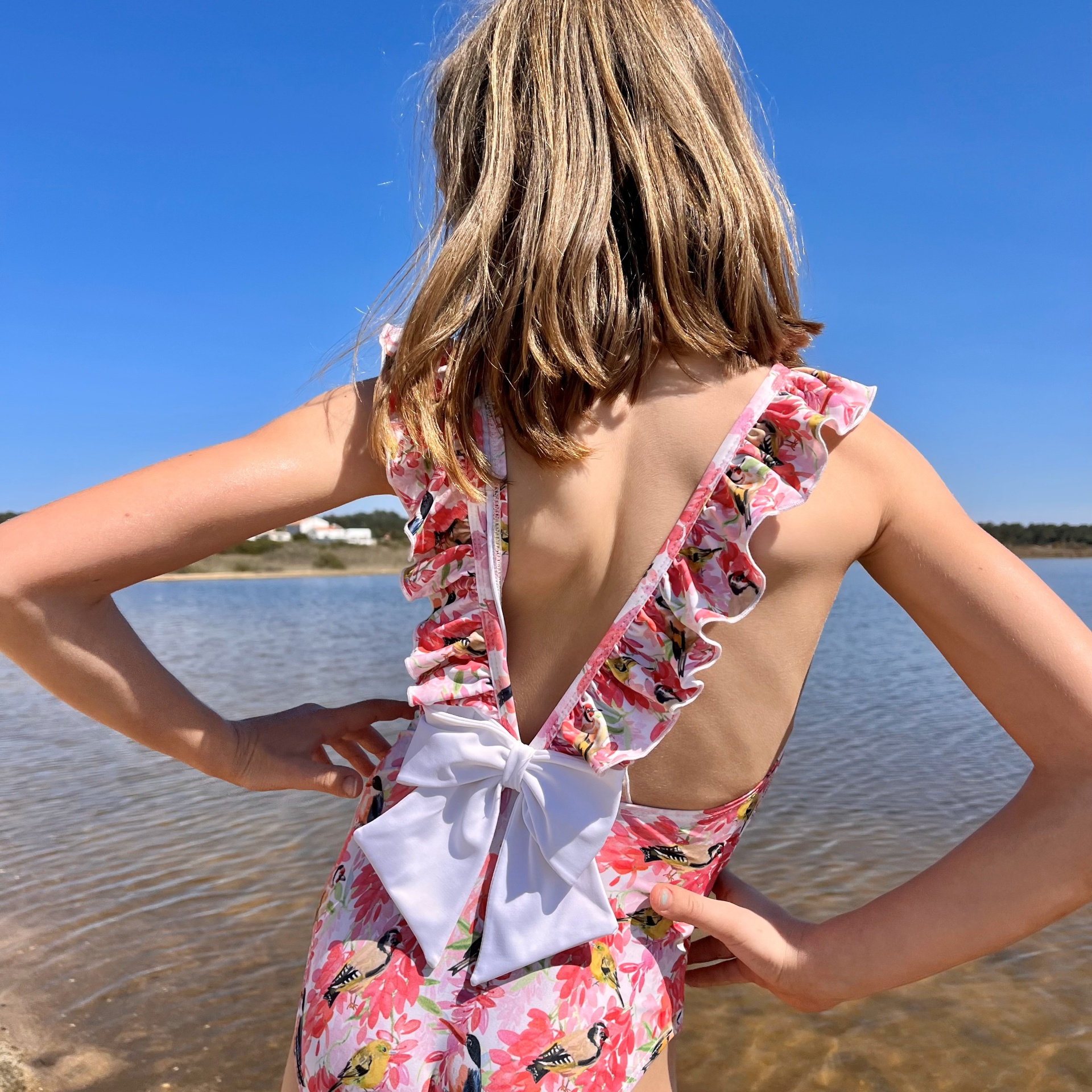 • Fato de banho infantil floral com folhos e laço branco, visto de costas numa praia