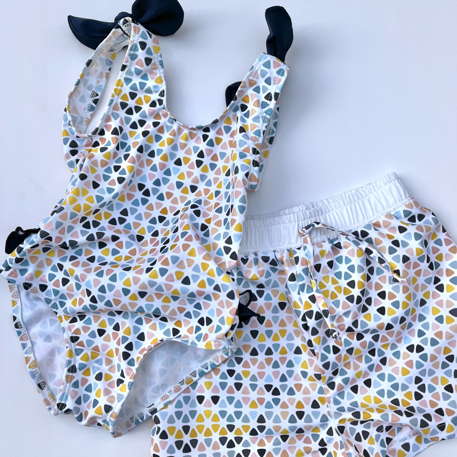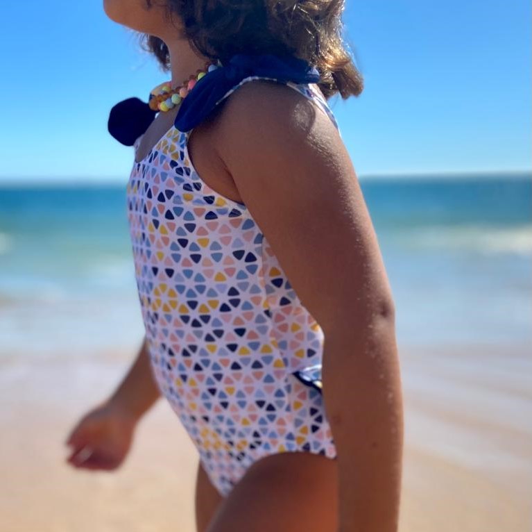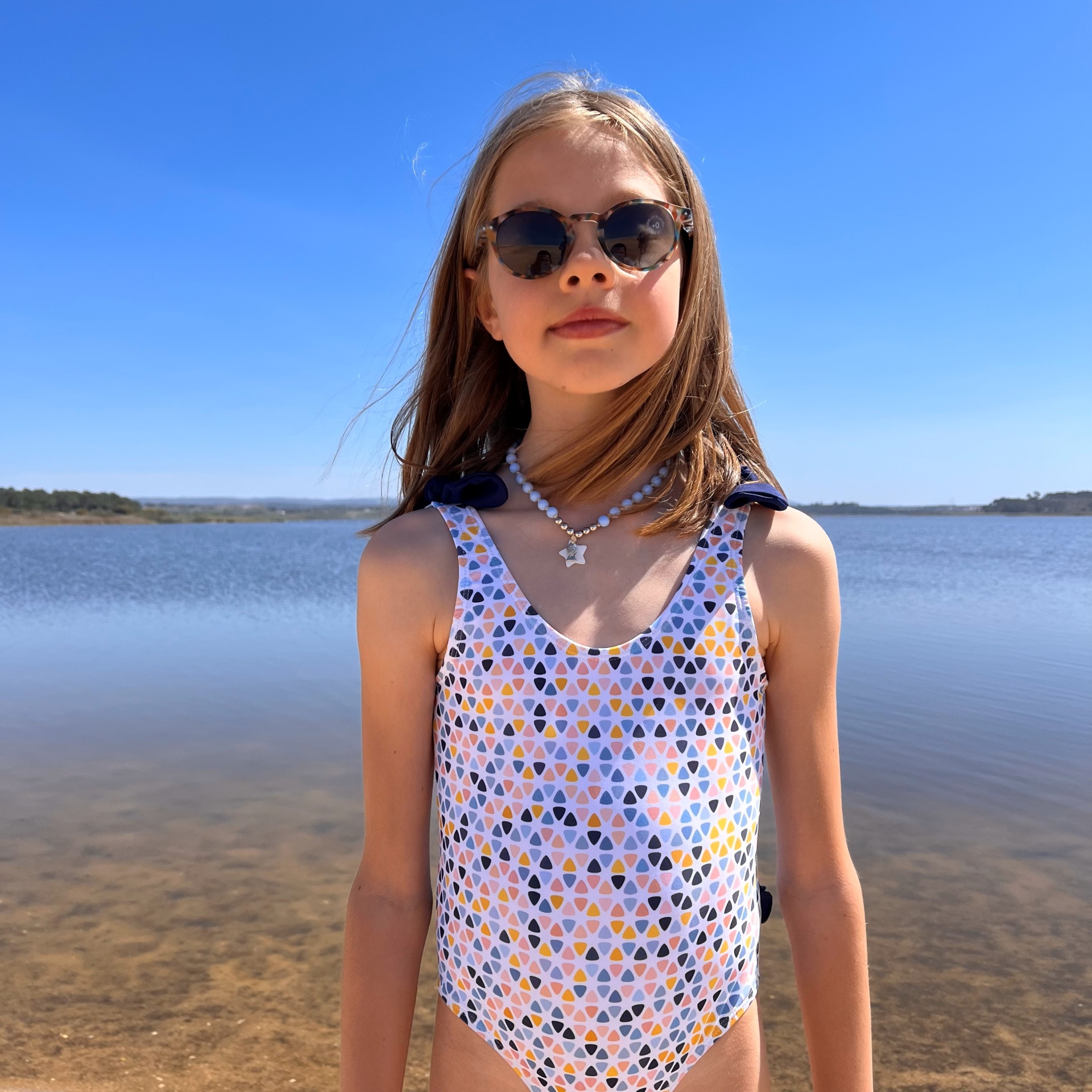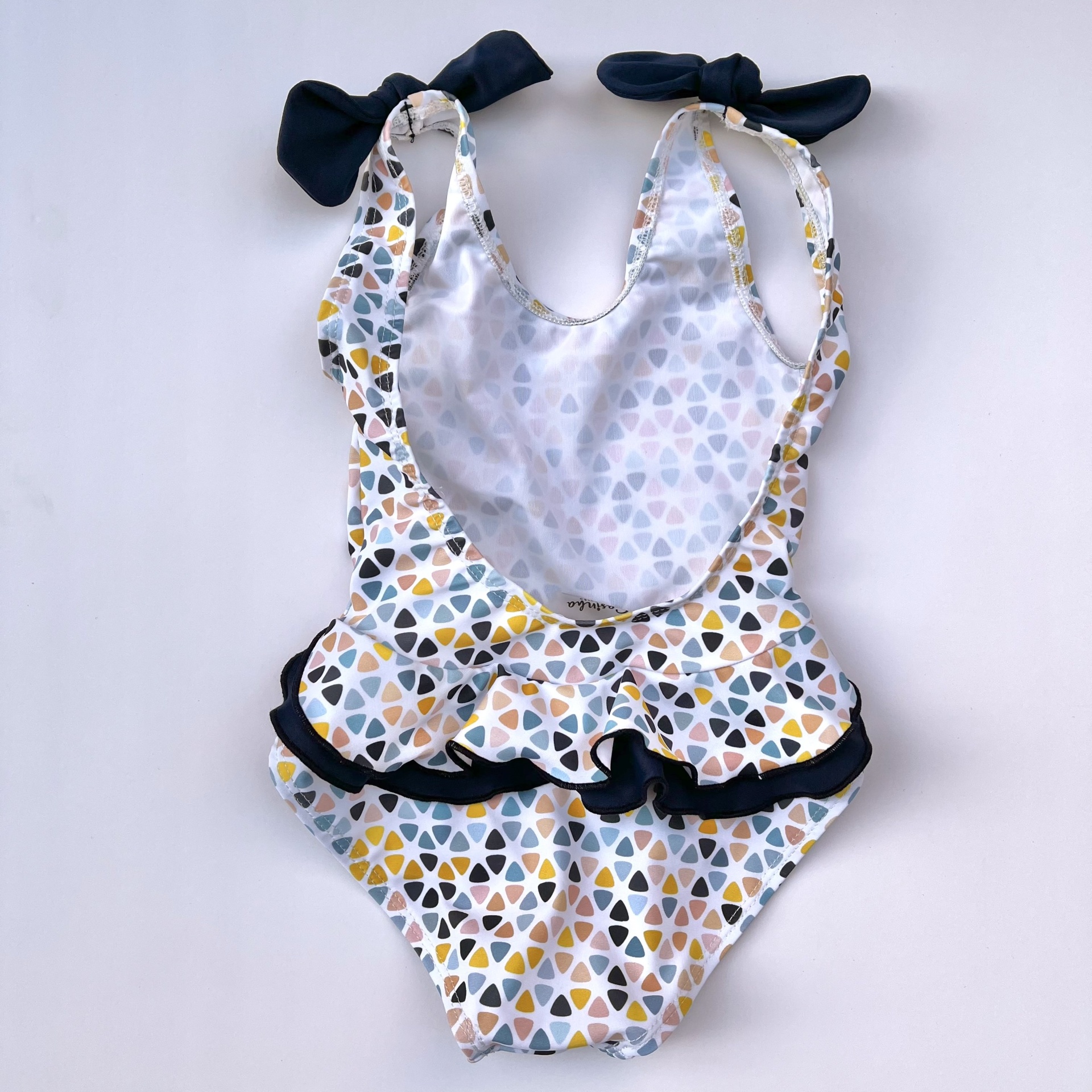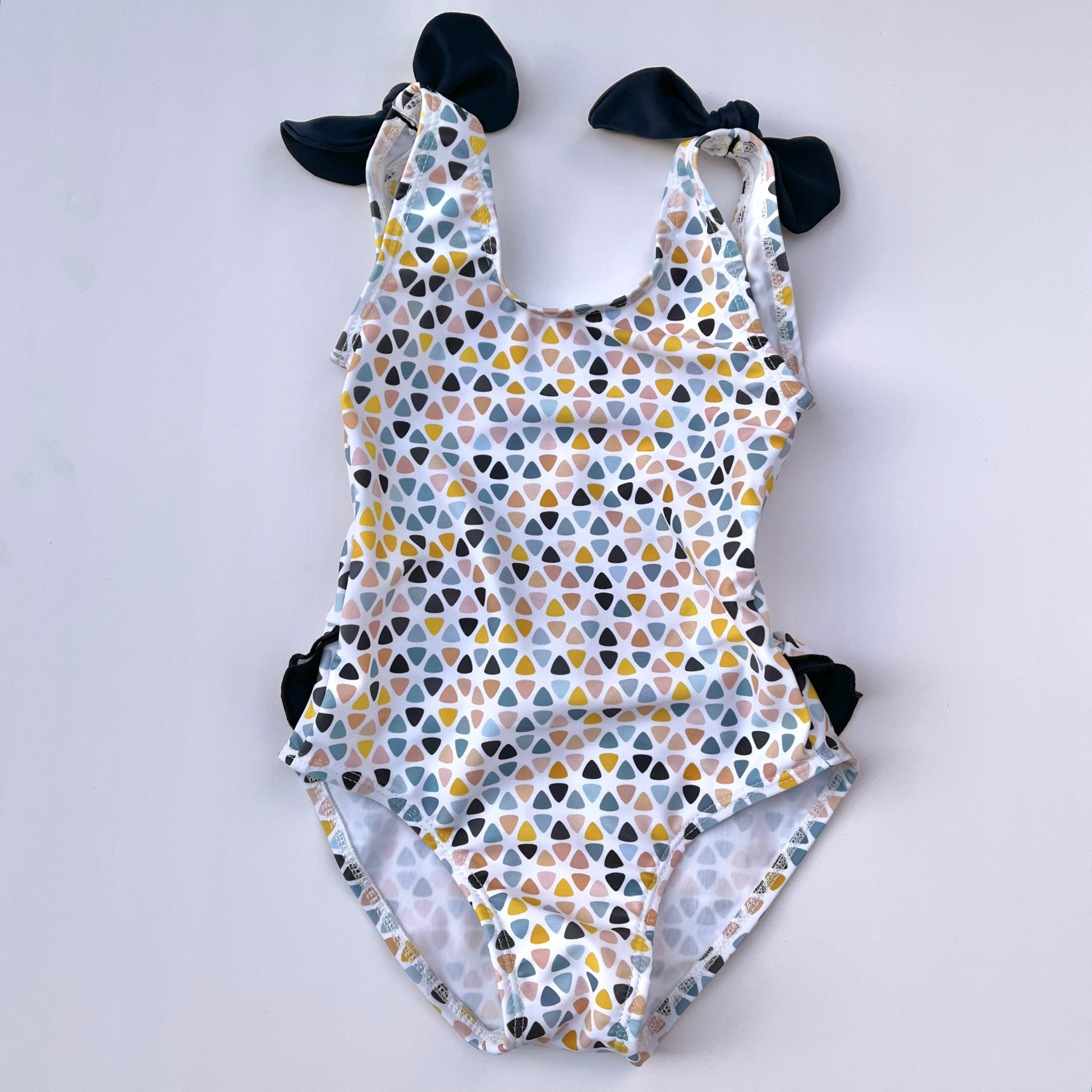 • Fato de banho infantil com padrão geométrico e laços pretos nos ombros