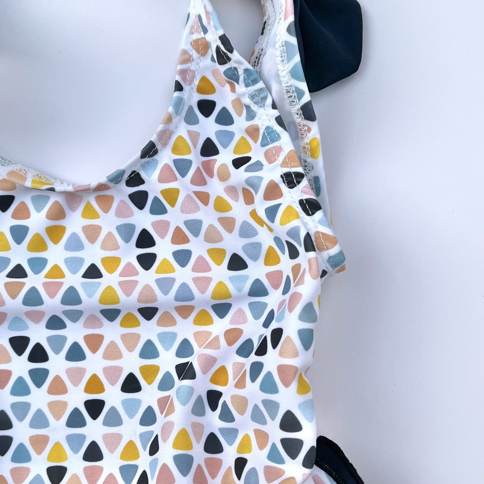 • Fato de banho para criança com padrão de triângulos coloridos e laços pretos