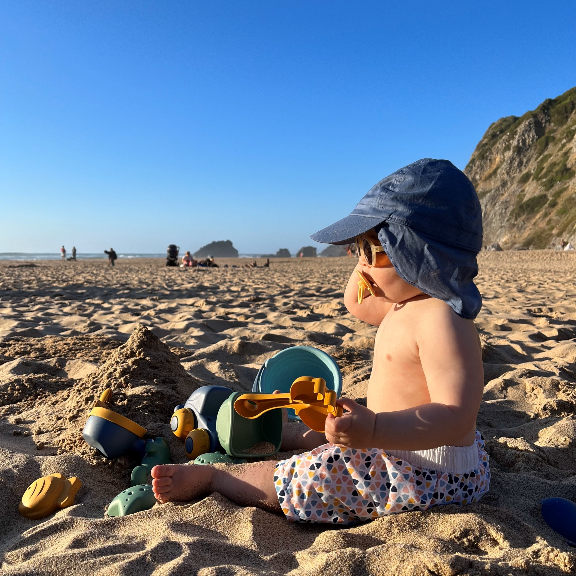 • Criança na praia com chapéu azul e calções a brincar com brinquedos de areia.