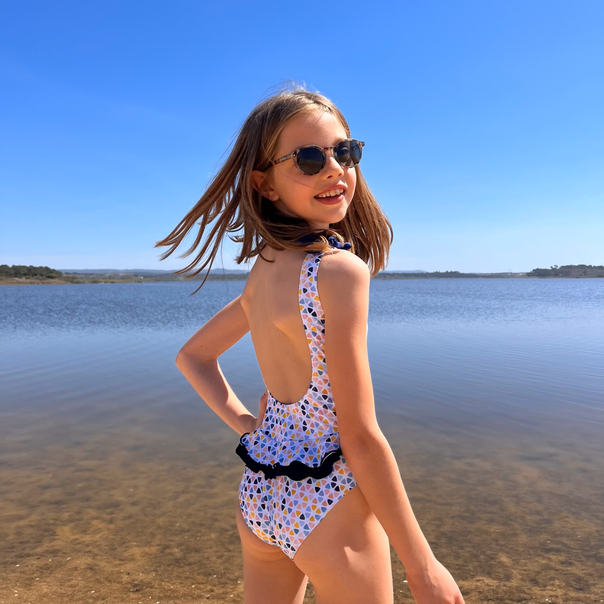• Menina de fato de banho estampado triângulos coloridos junto a lago sob céu azul