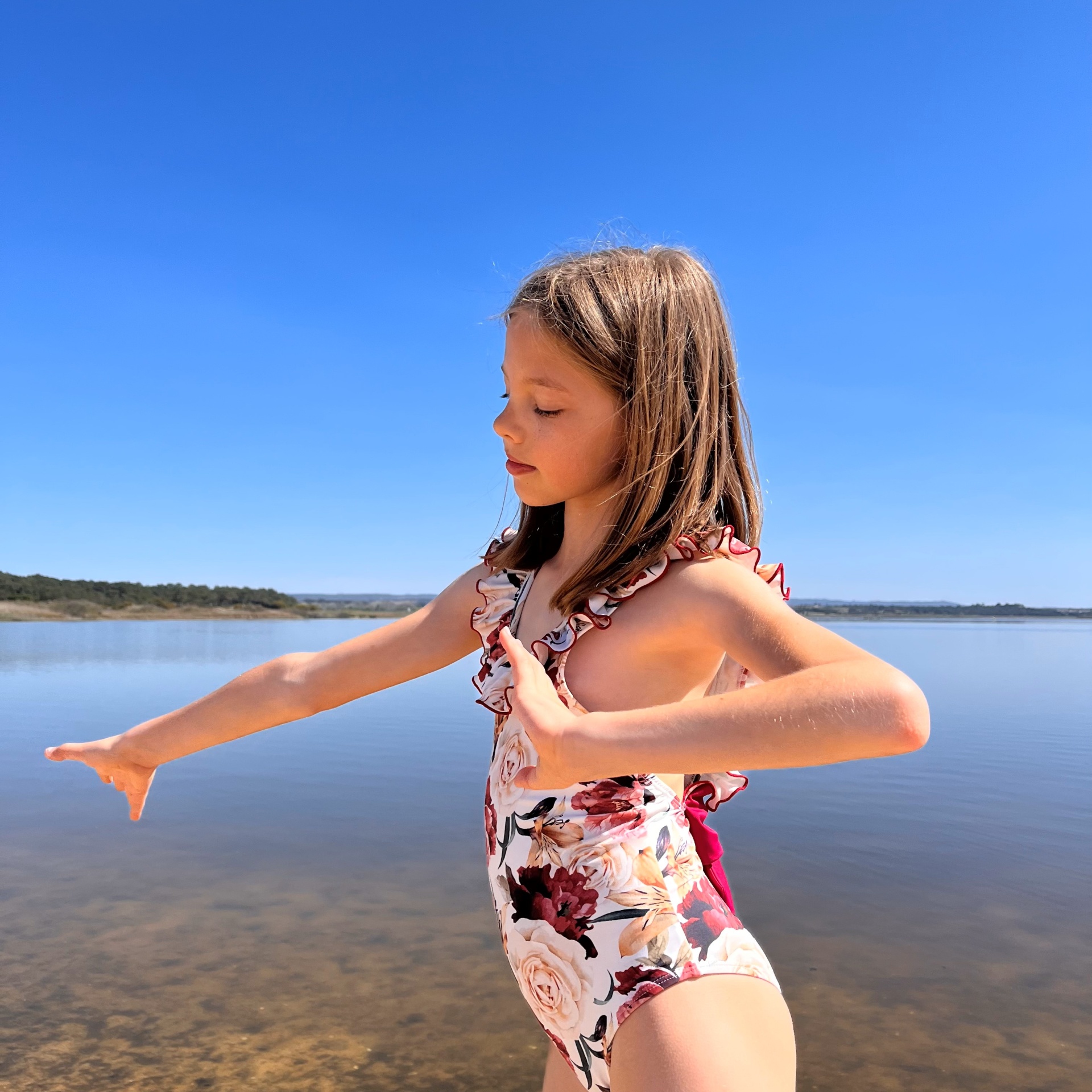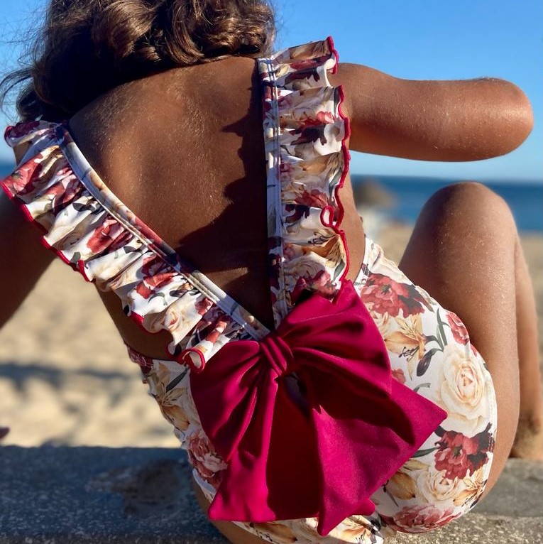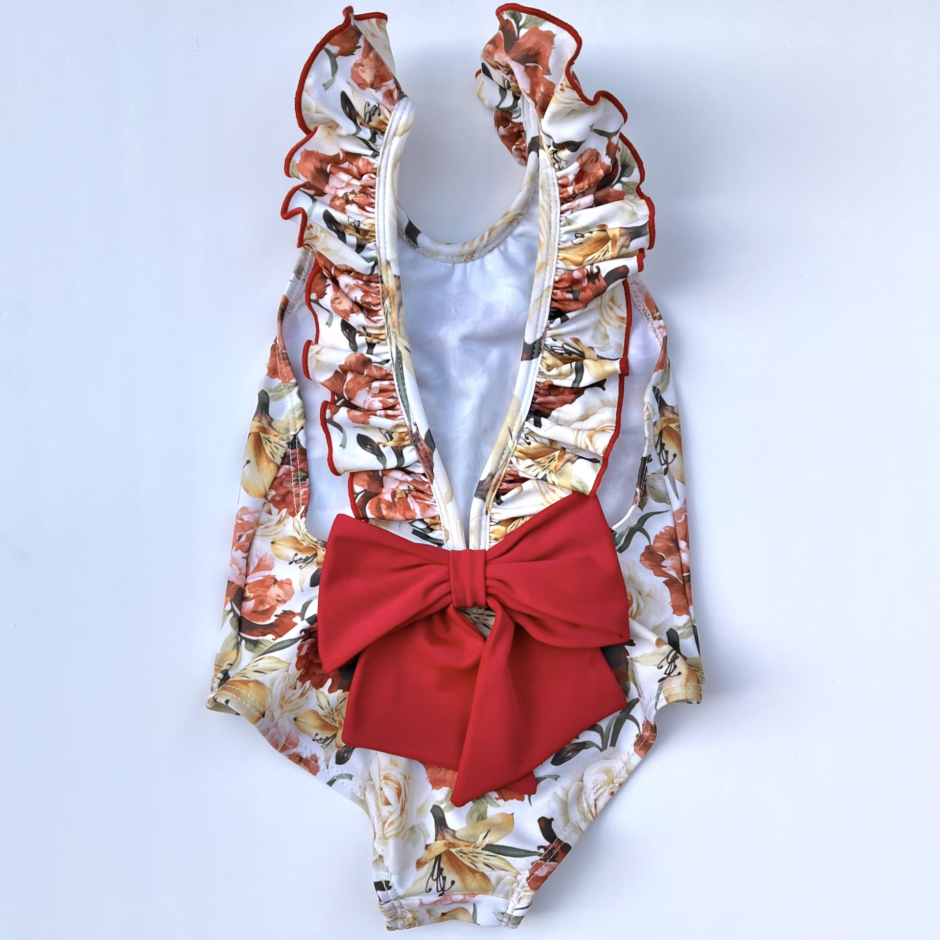 • Fato de banho infantil floral com folhos e laço vermelho nas costas