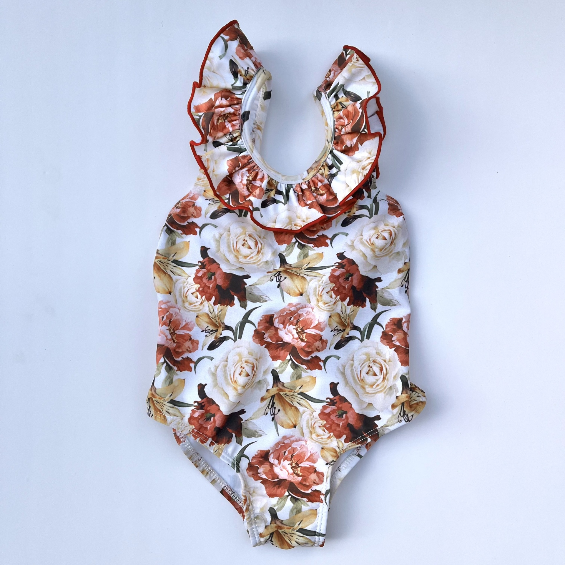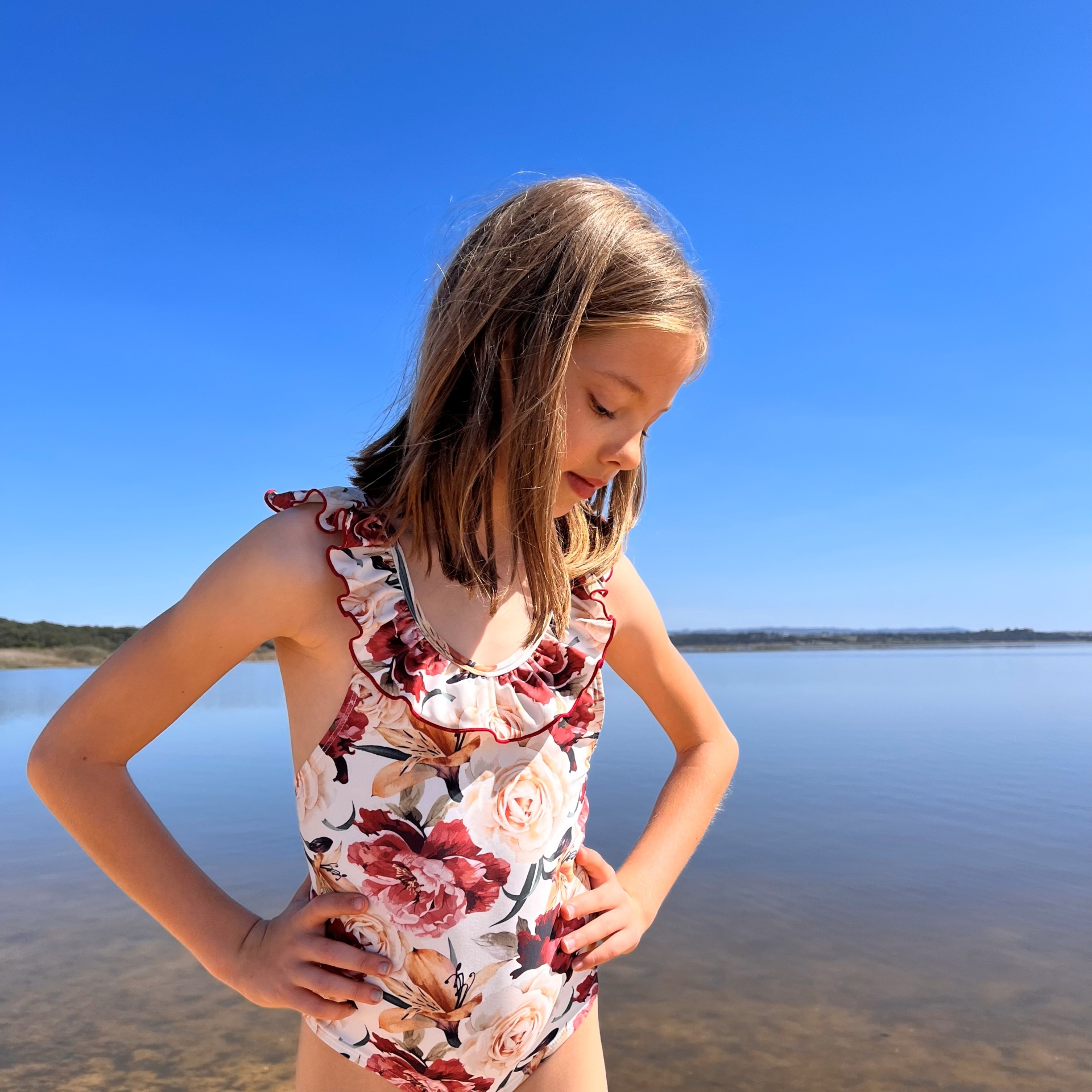 • Fato de banho infantil floral com folho na gola sobre fundo branco