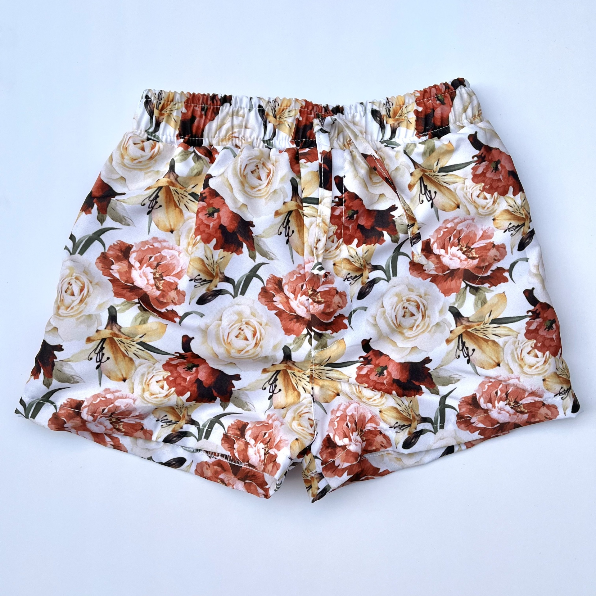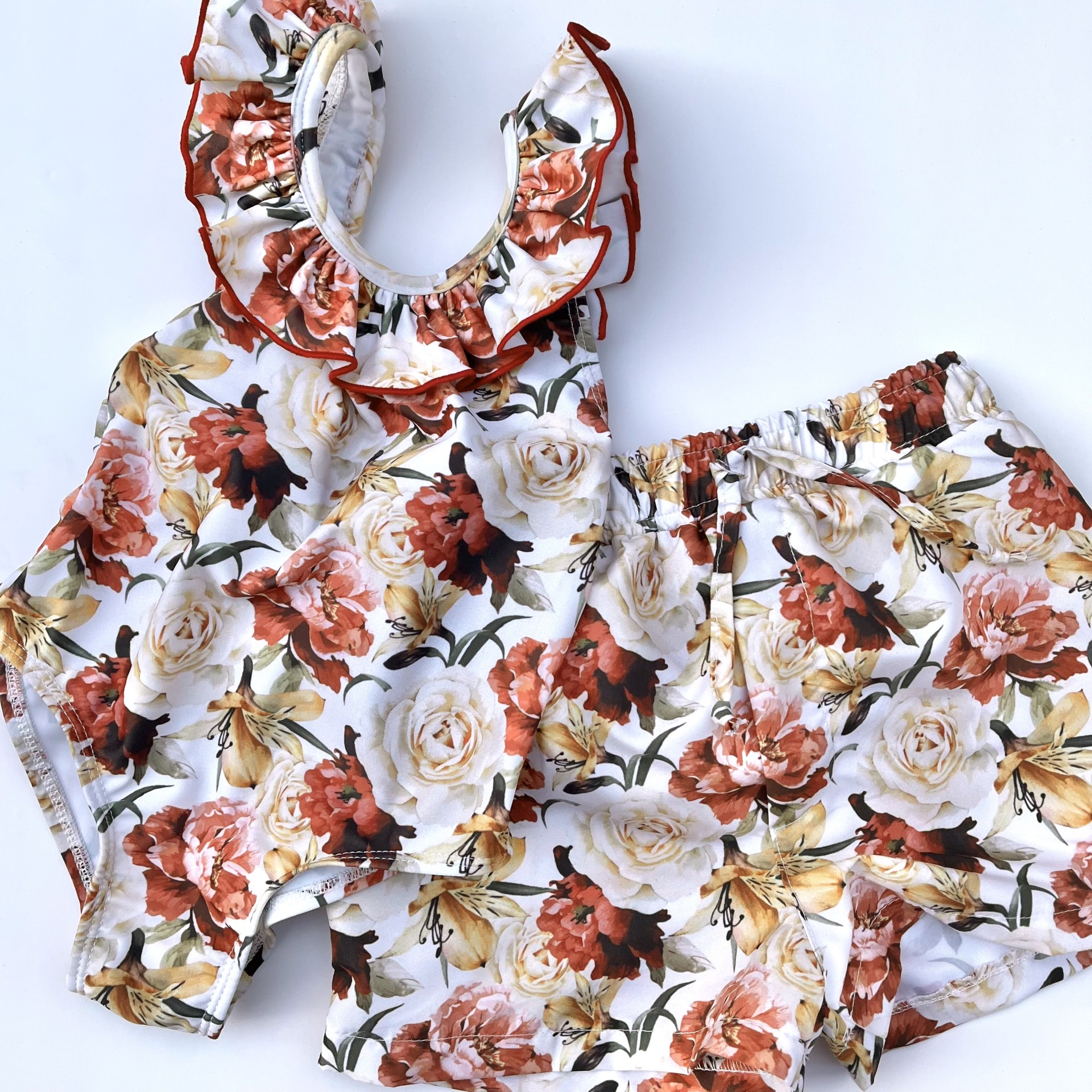 • Conjunto infantil floral com camisa sem mangas com folhos e calções
