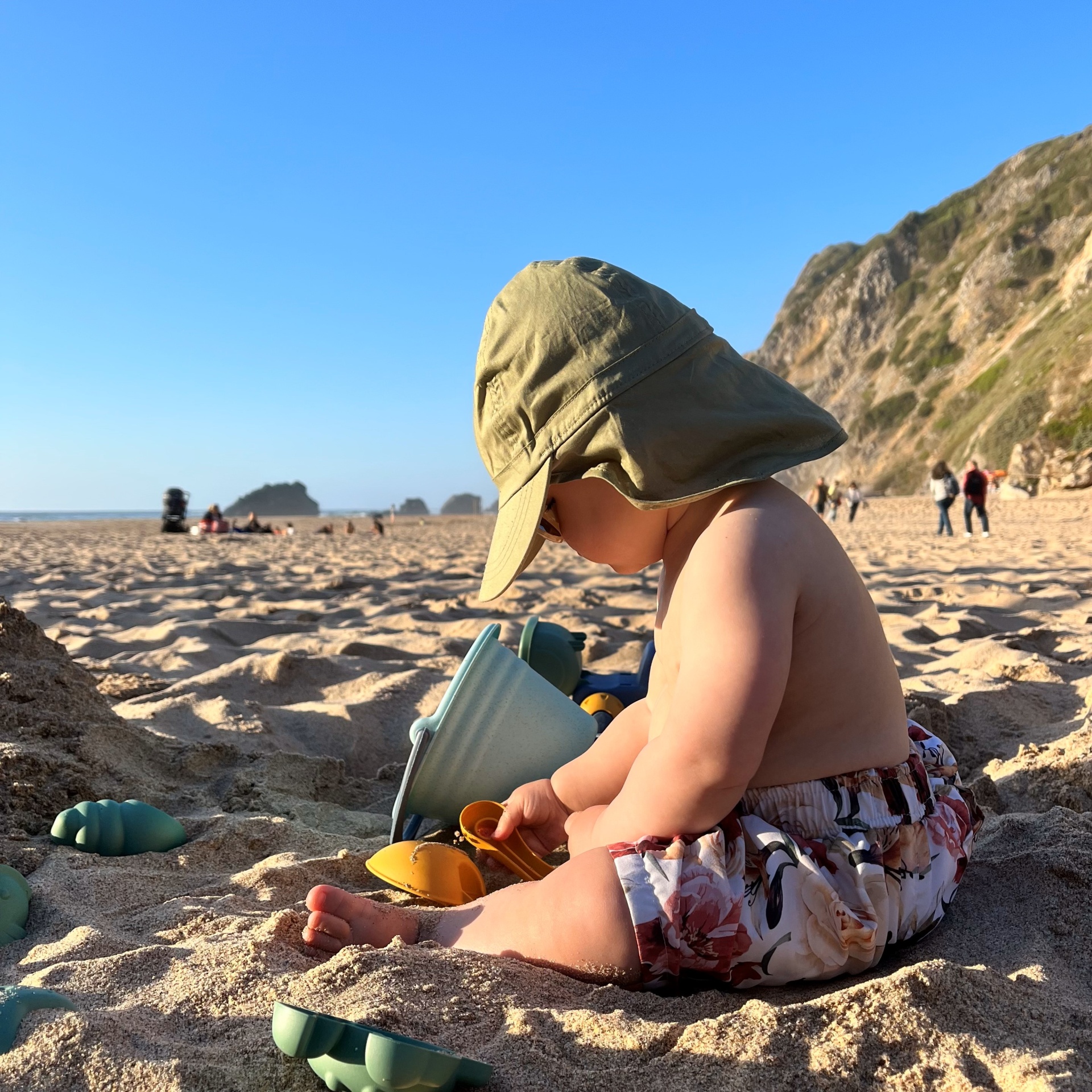 • Bebé a brincar com brinquedos na areia da praia sob chapéu verde