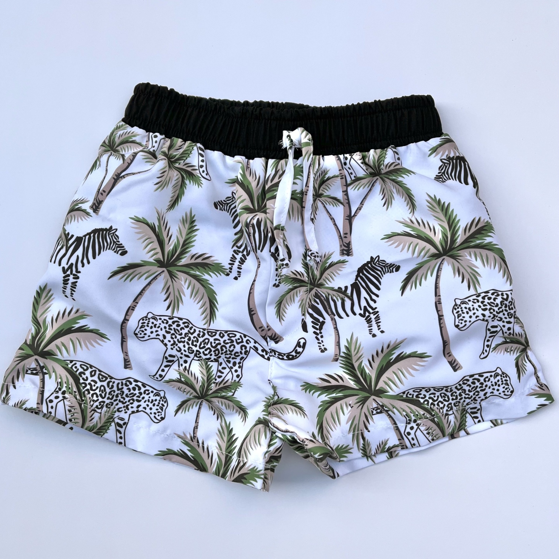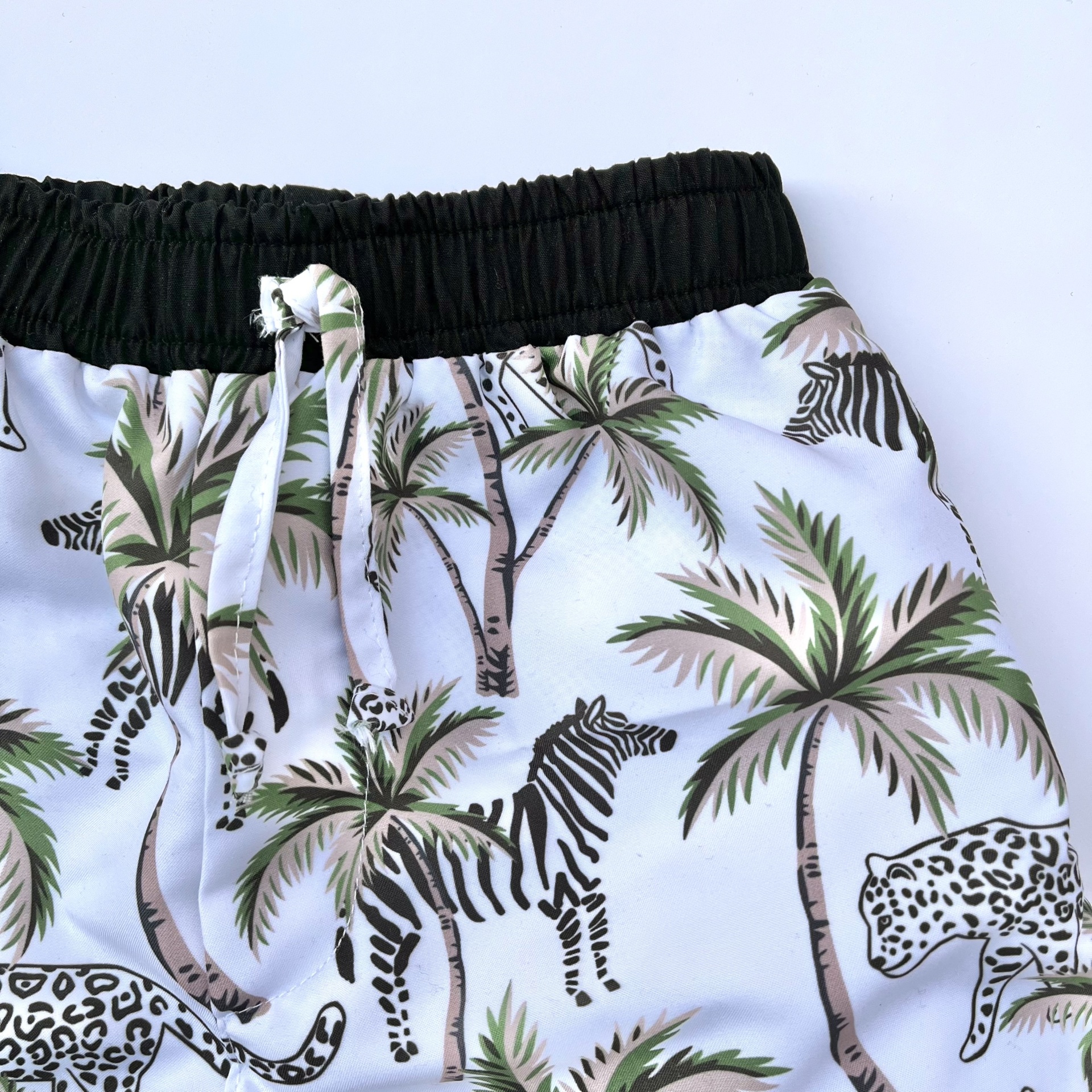 • Calções brancos com padrão de zebras e leopardos e palmeiras verdes, cós preto e cordão branco