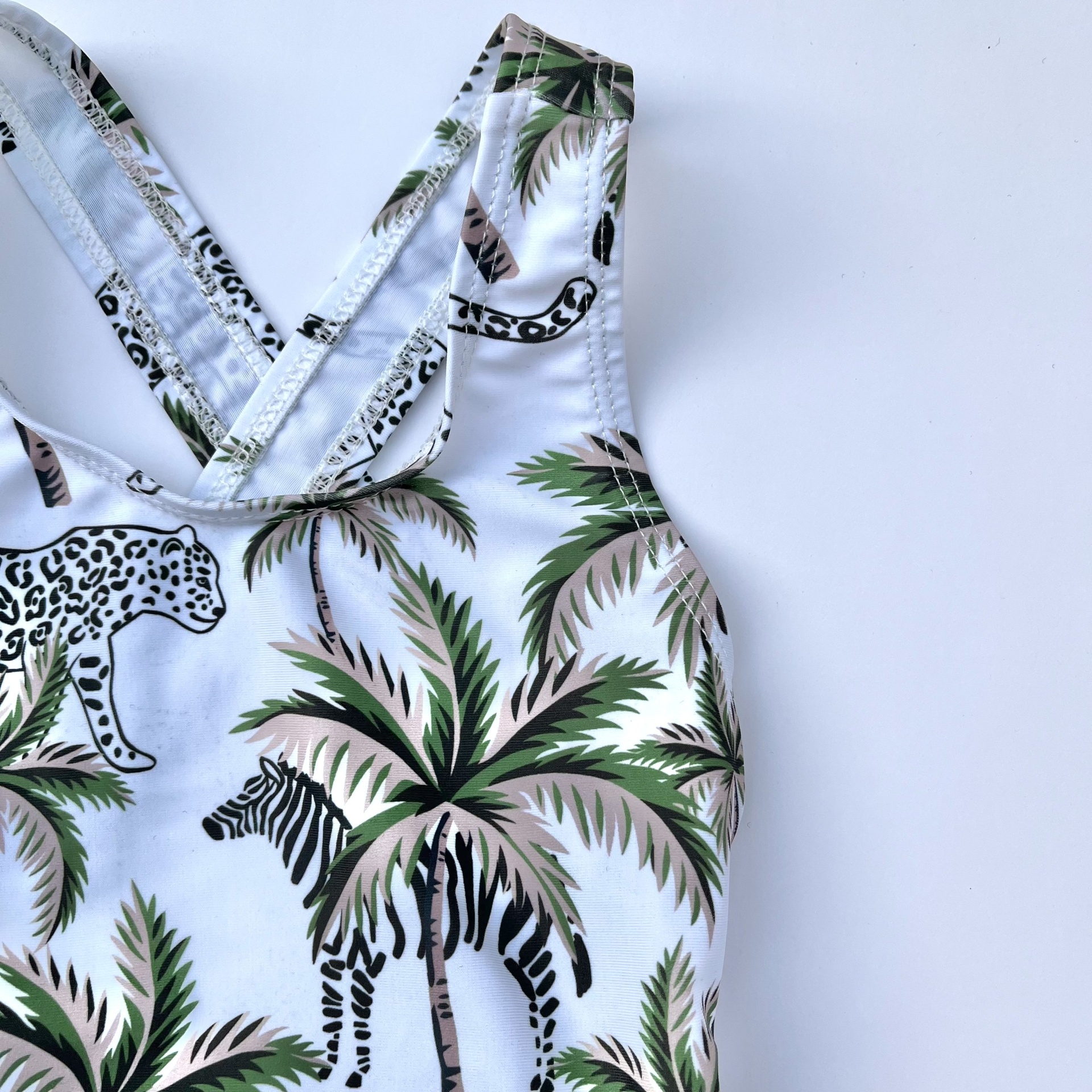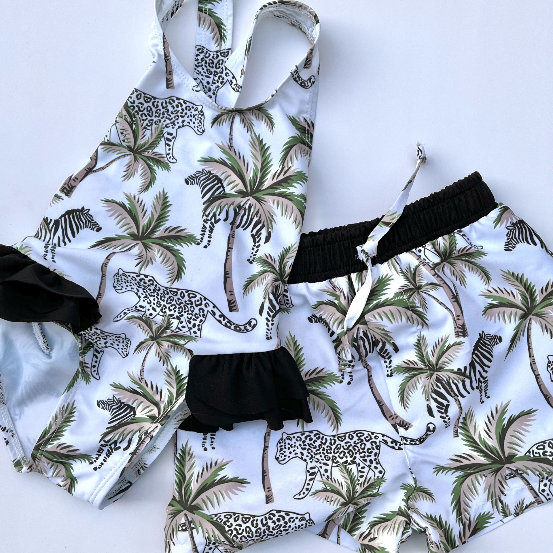 • Fato de banho infantil branco com padrão animal e folhagens e detalhes em preto