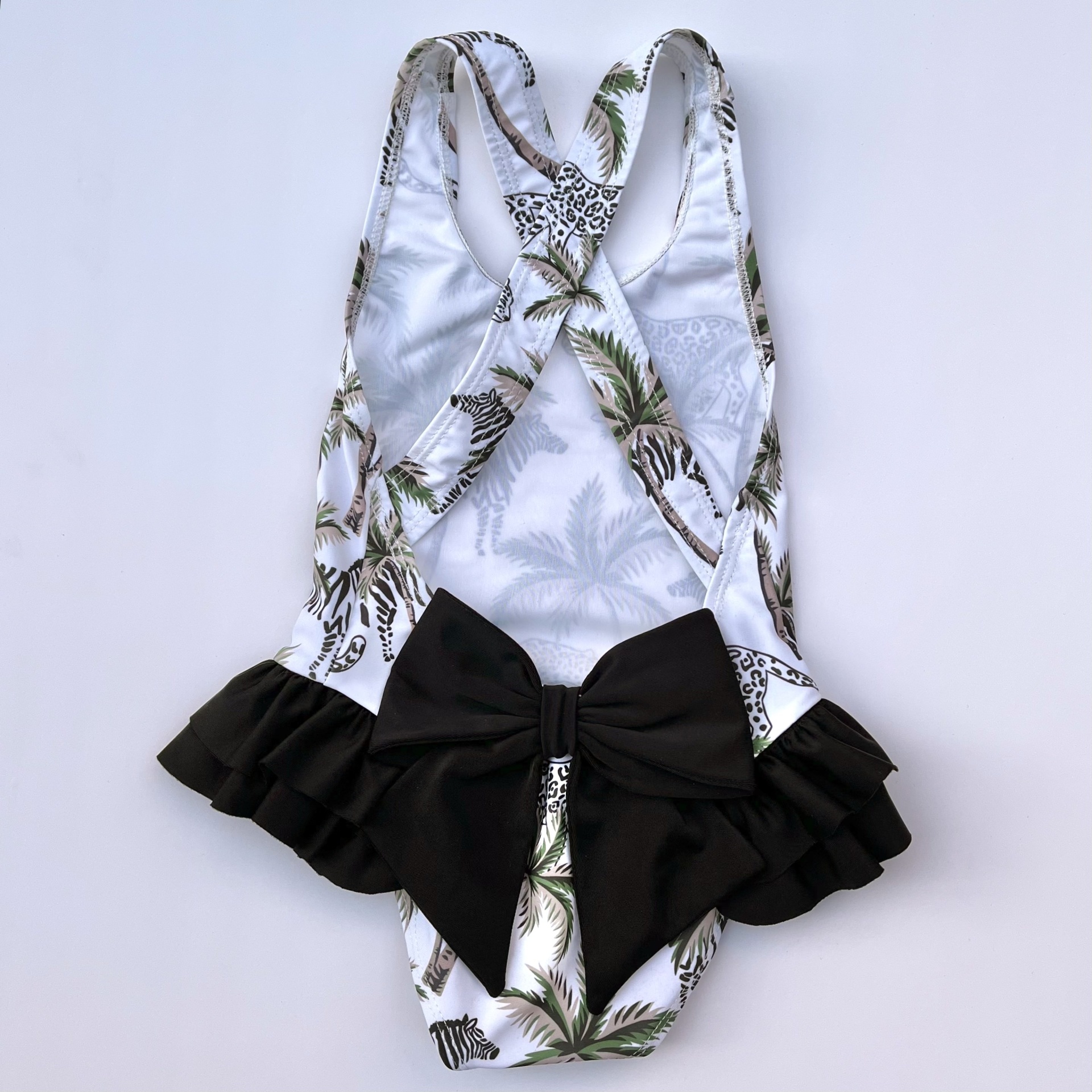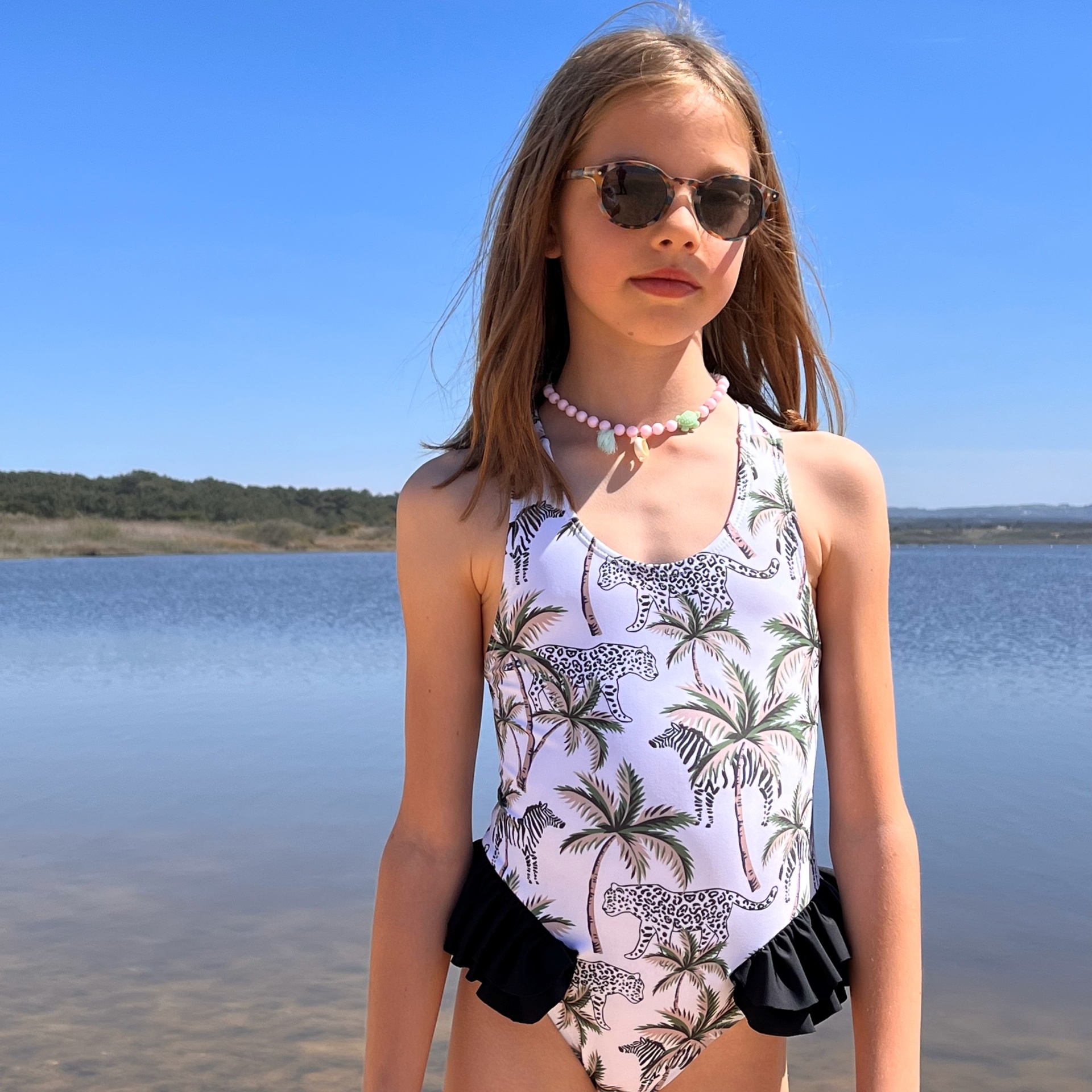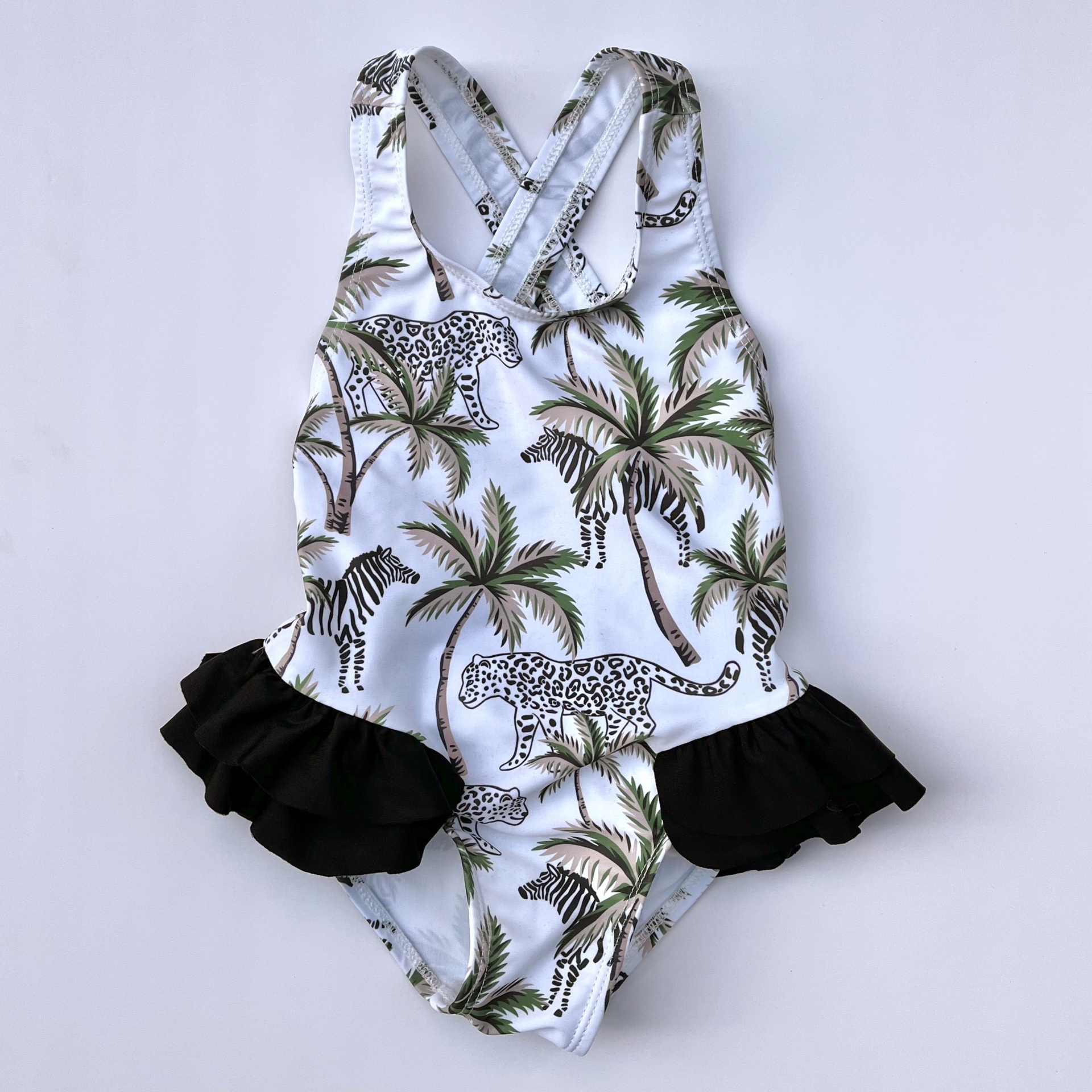 • Fato de banho infantil branco com estampa de onças e zebras e folhos pretos