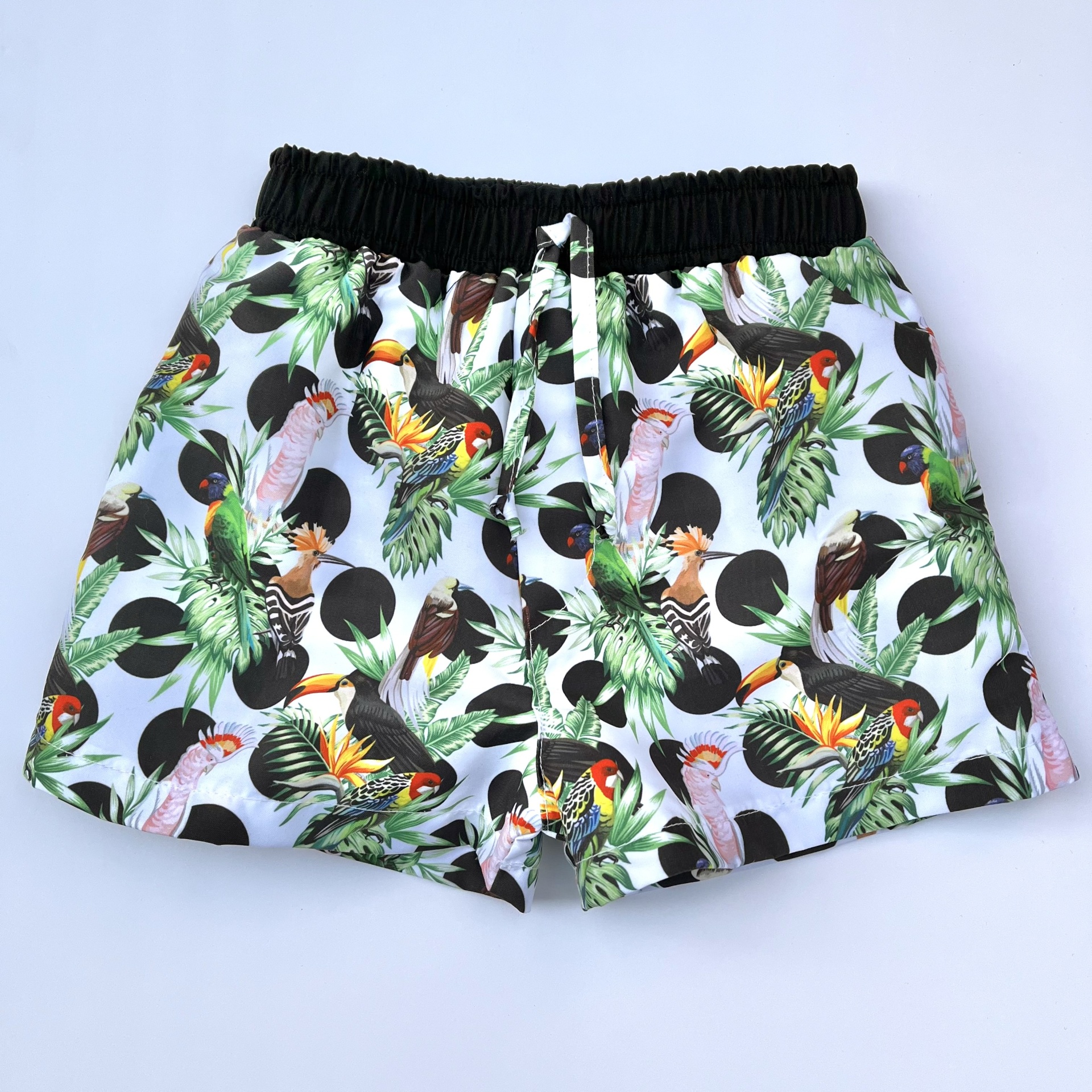 • Calções com padrão tropical e cintura elástica preta