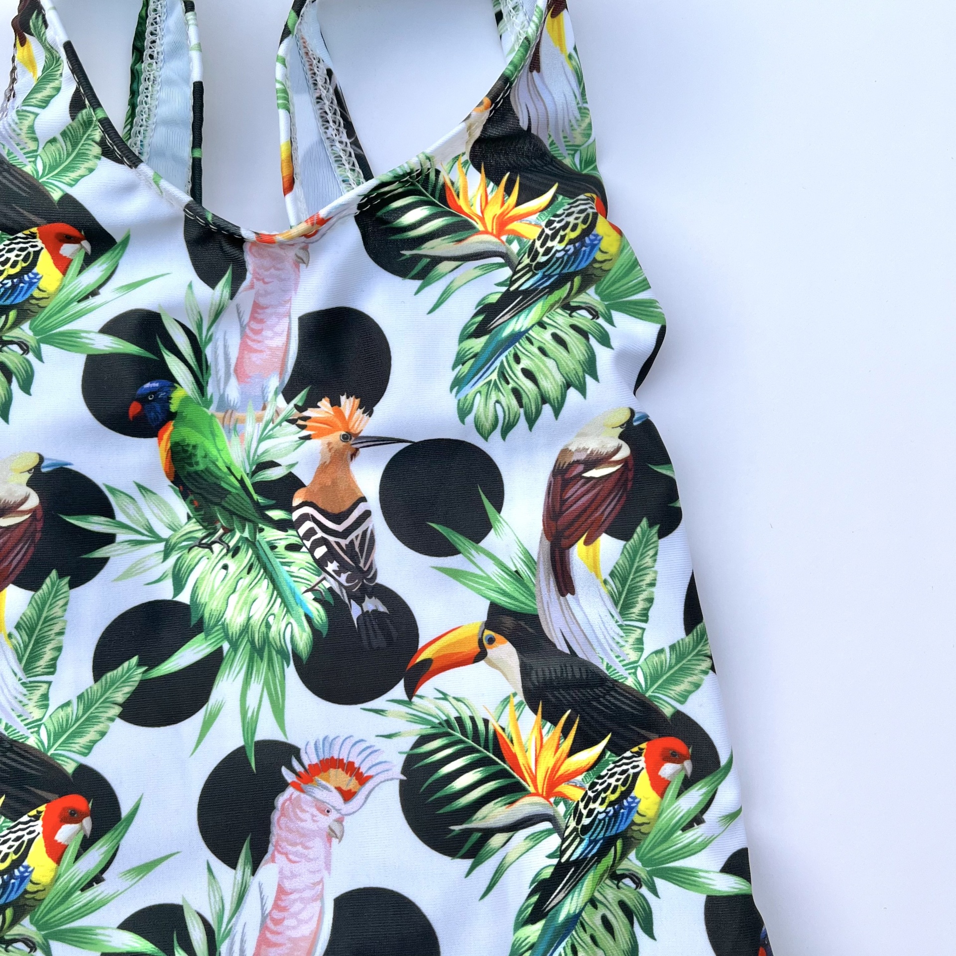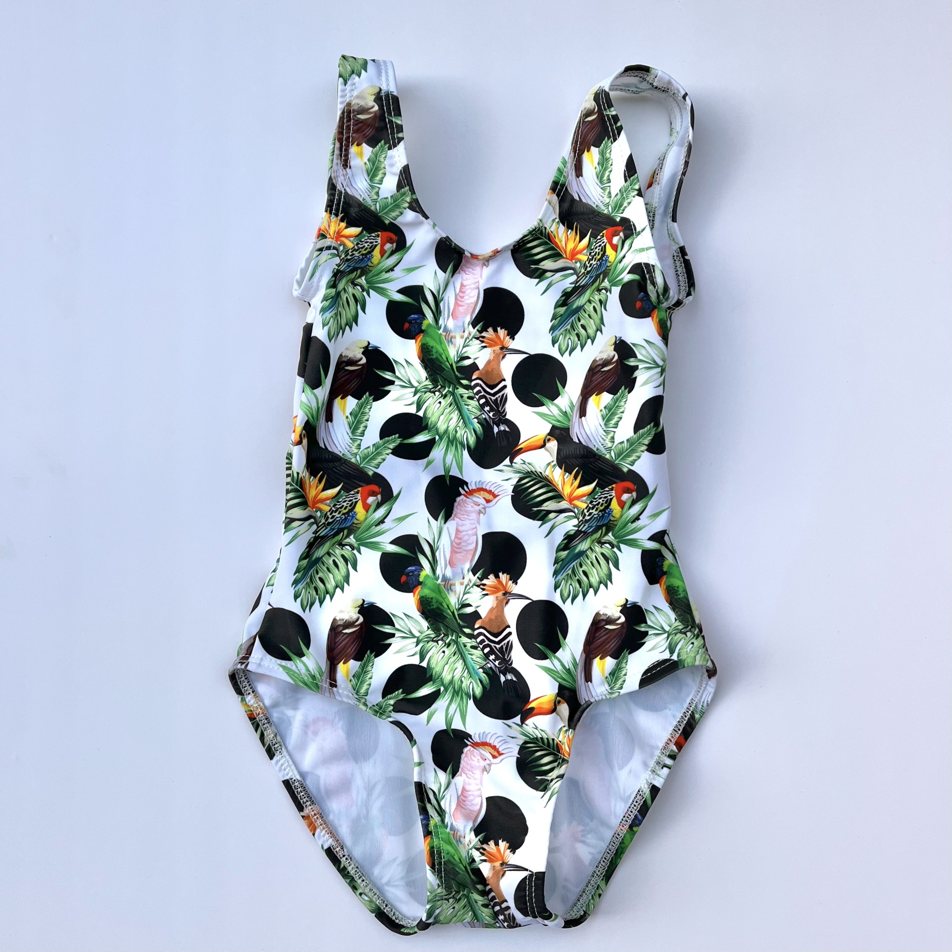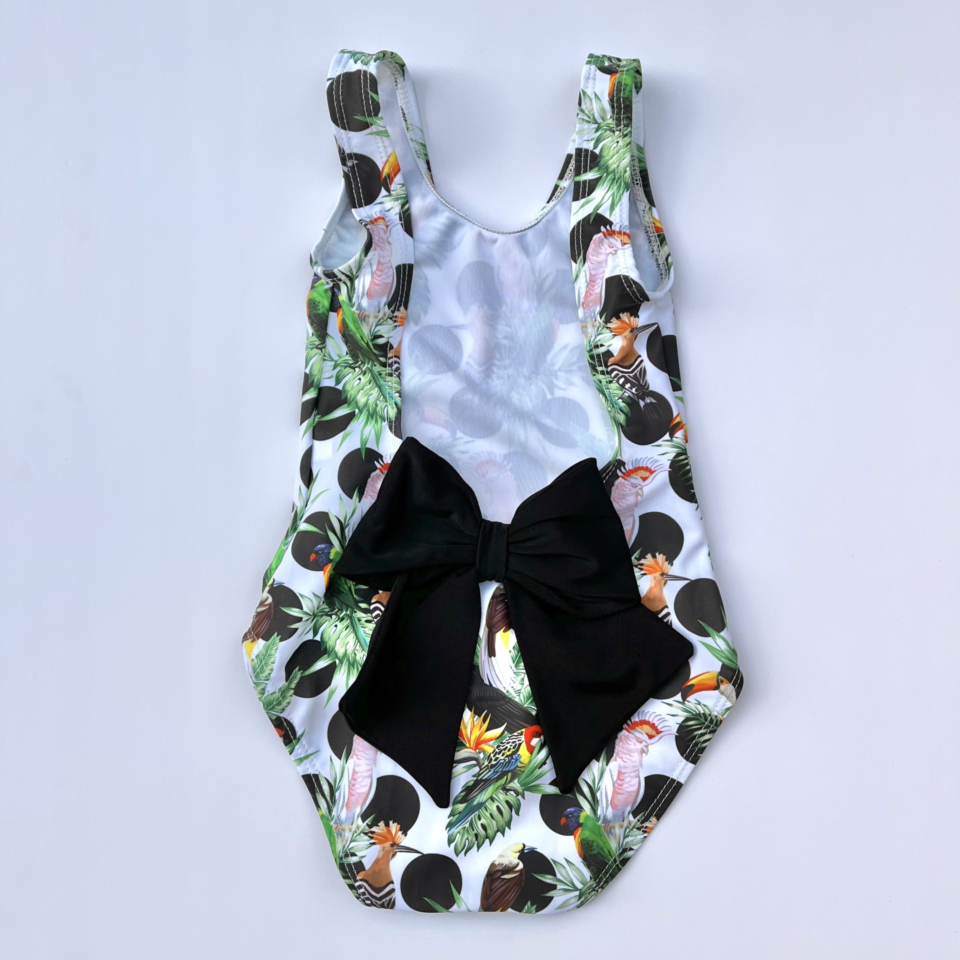 • Fato de banho infantil estampado com pássaros e laço preto nas costas em ambiente de lago