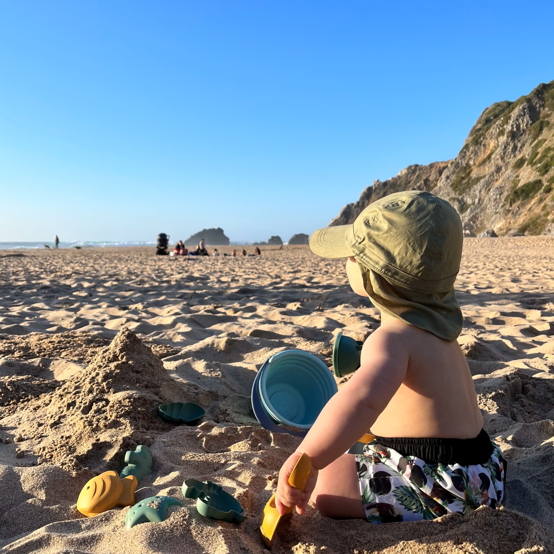 • Criança a brincar com balde e pás na praia, chapéu verde e calções com padrão