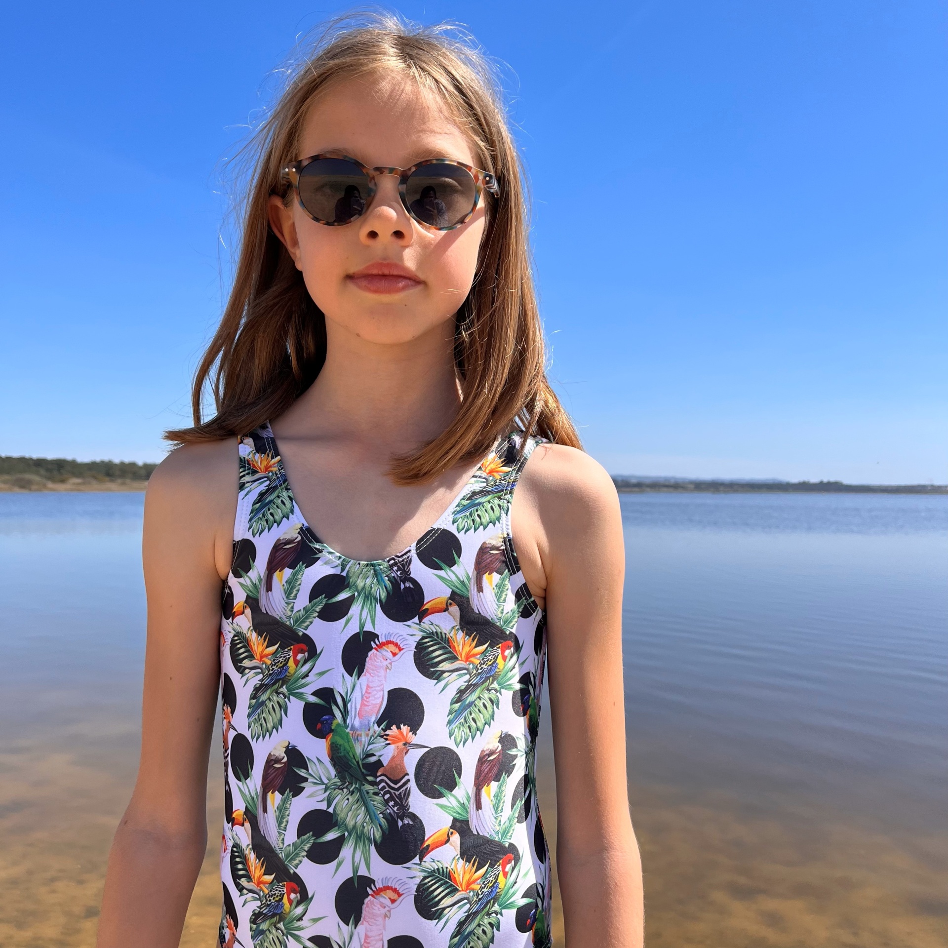 • Menina com fato de banho tropical e óculos de sol junto a água