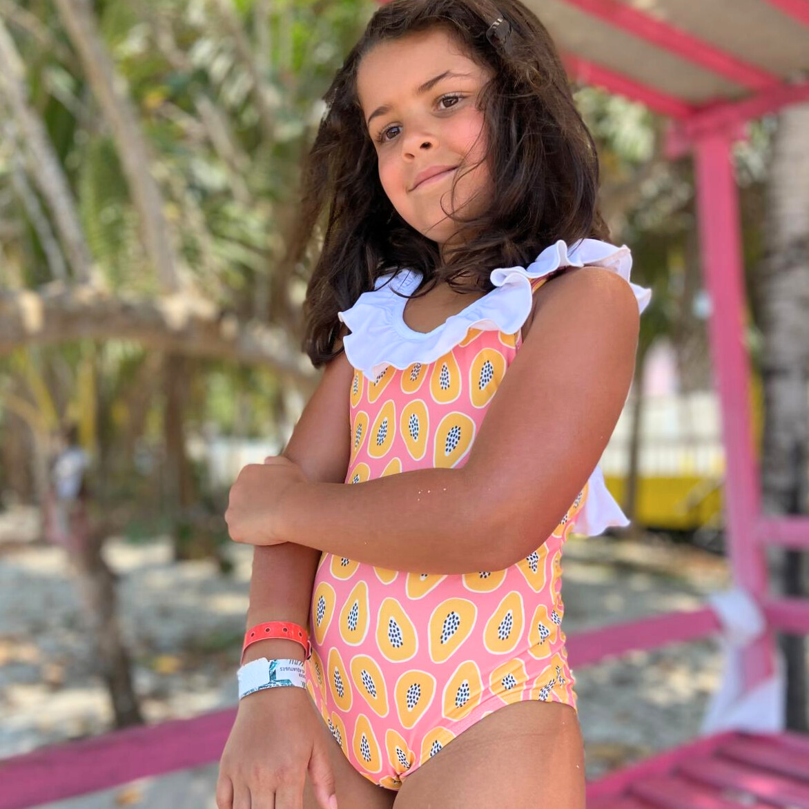 • Fato de banho cor-de-rosa com padrão de papaias e gola branca em ambiente exterior