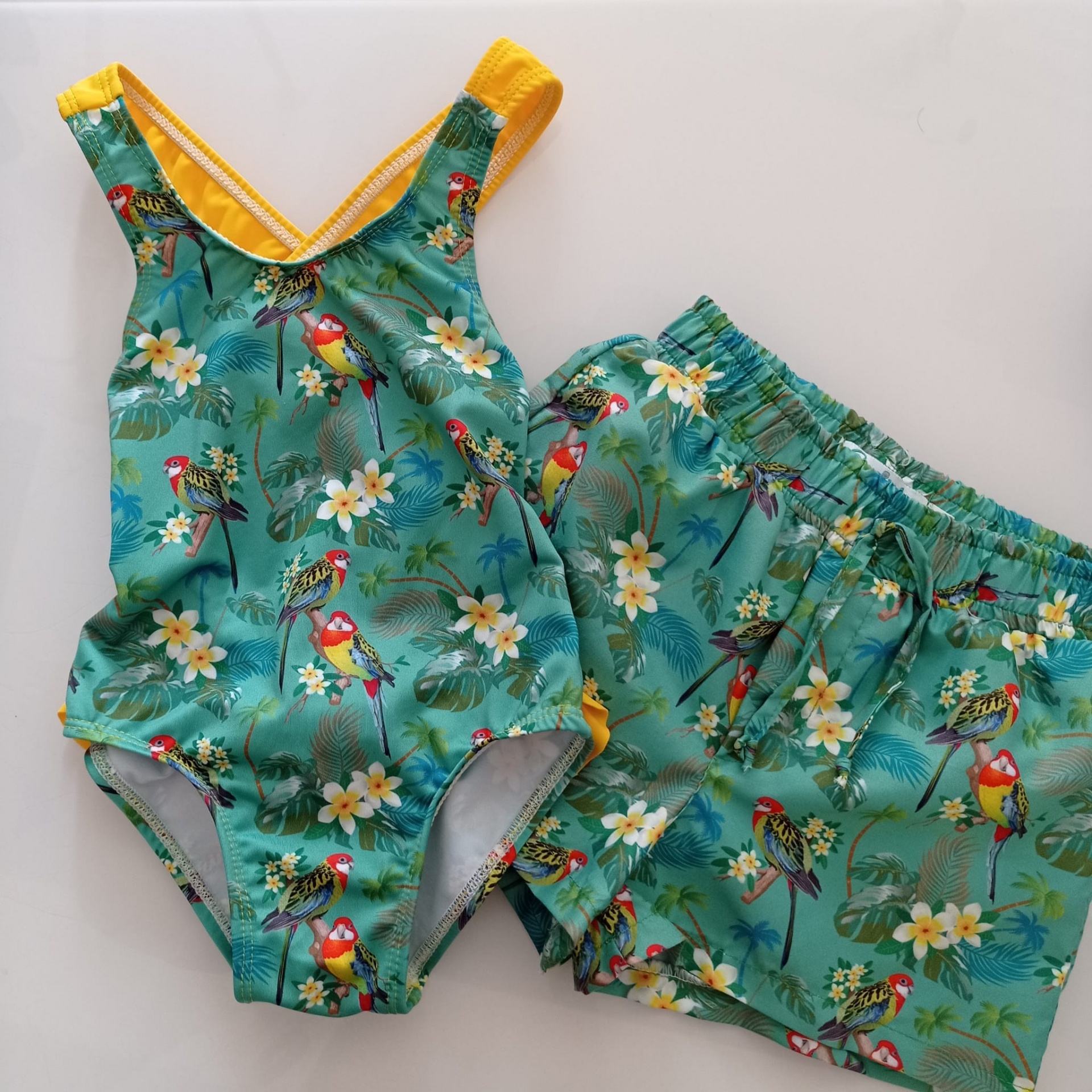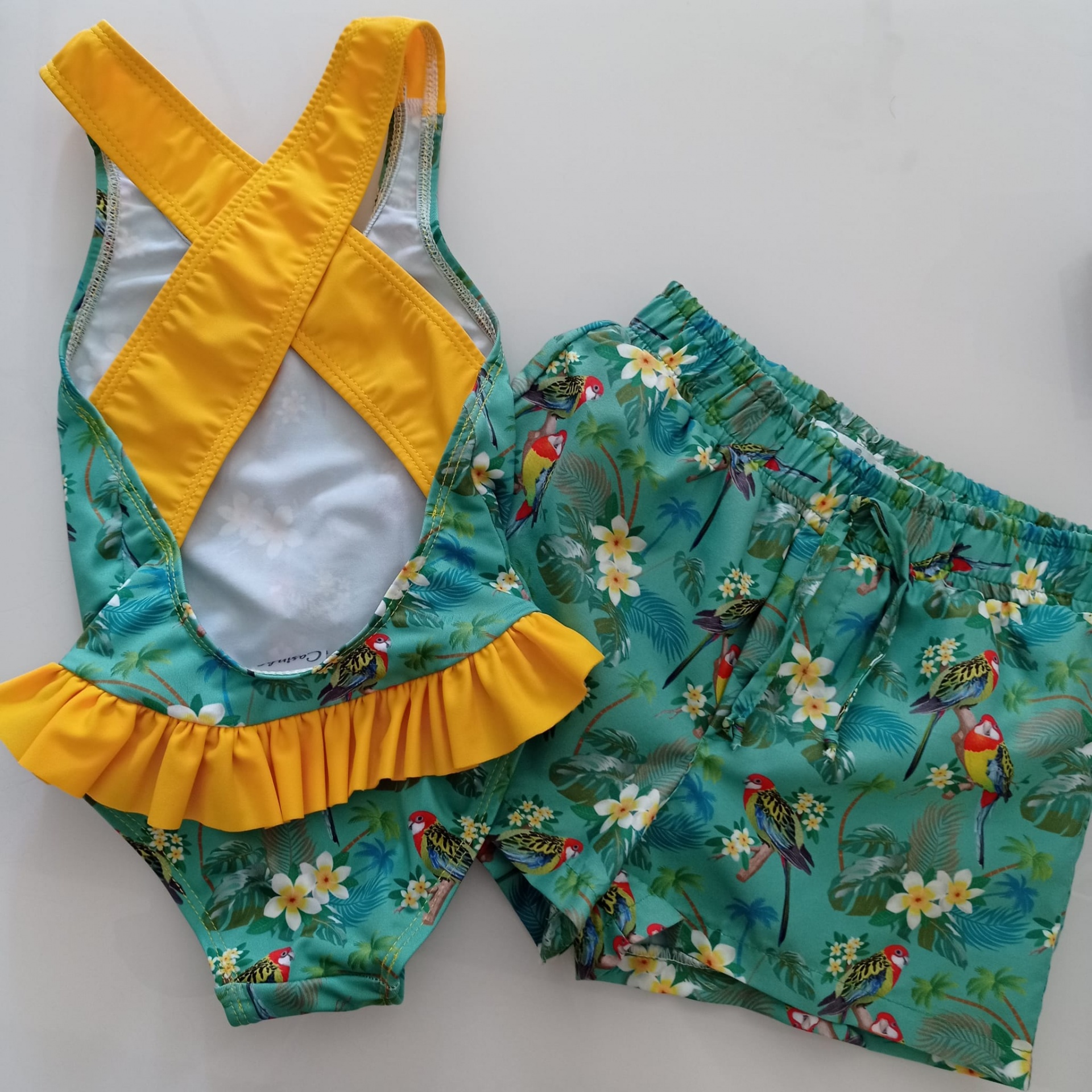 • Fato de banho e calções infantis com padrão tropical colorido e detalhes amarelos