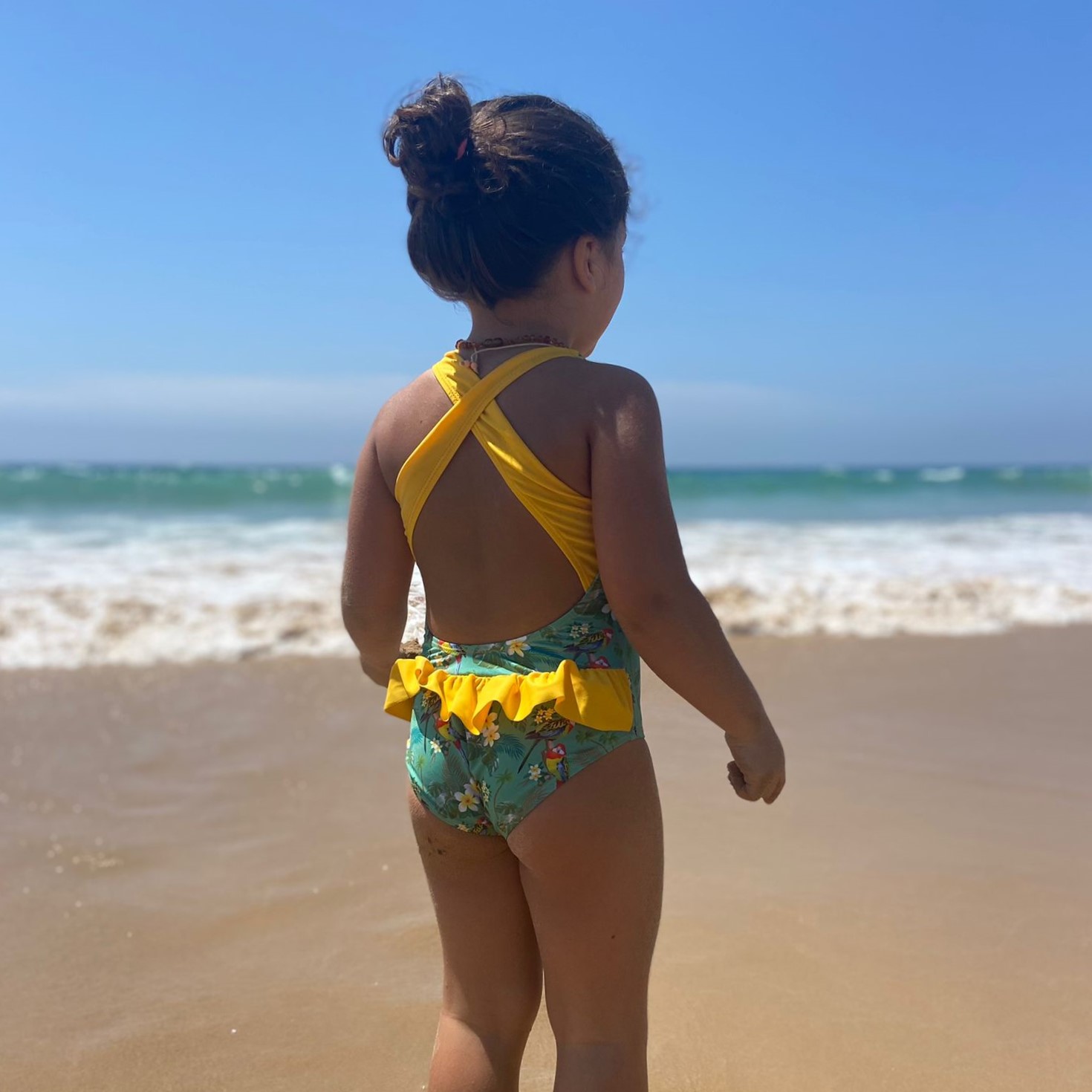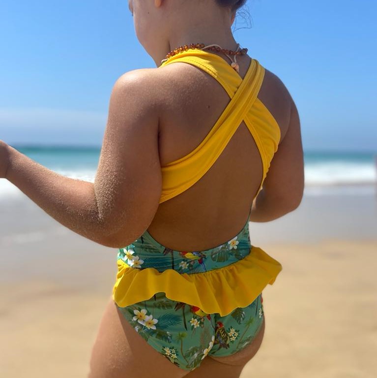 • Fato de banho infantil amarelo e verde com estampado floral numa praia