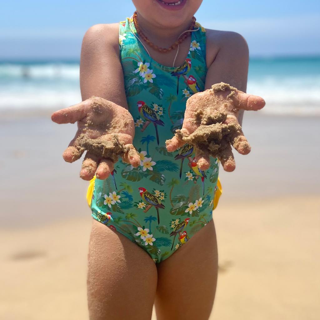 • Fato de banho infantil azul turquesa com flores e pássaros na praia