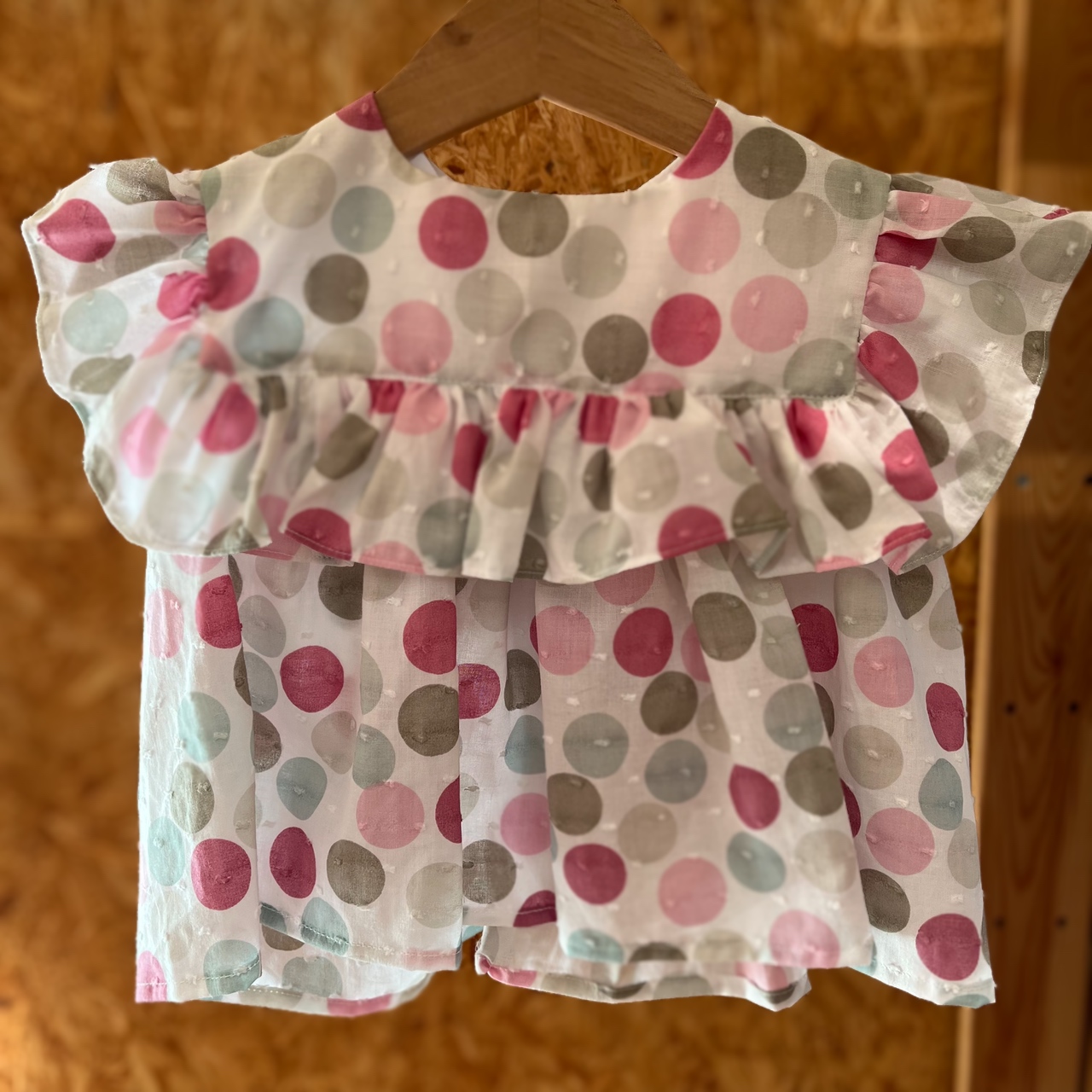 • Blusa infantil colorida com padrão de círculos e folho pendurada num cabide