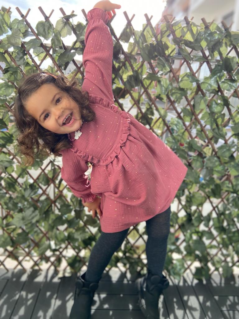 • Menina com vestido rosa e collants pretos, em frente a treliça verde