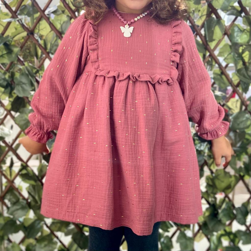 • Vestido rosa com babados e detalhes dourados, colar de contas com pendente de borboleta