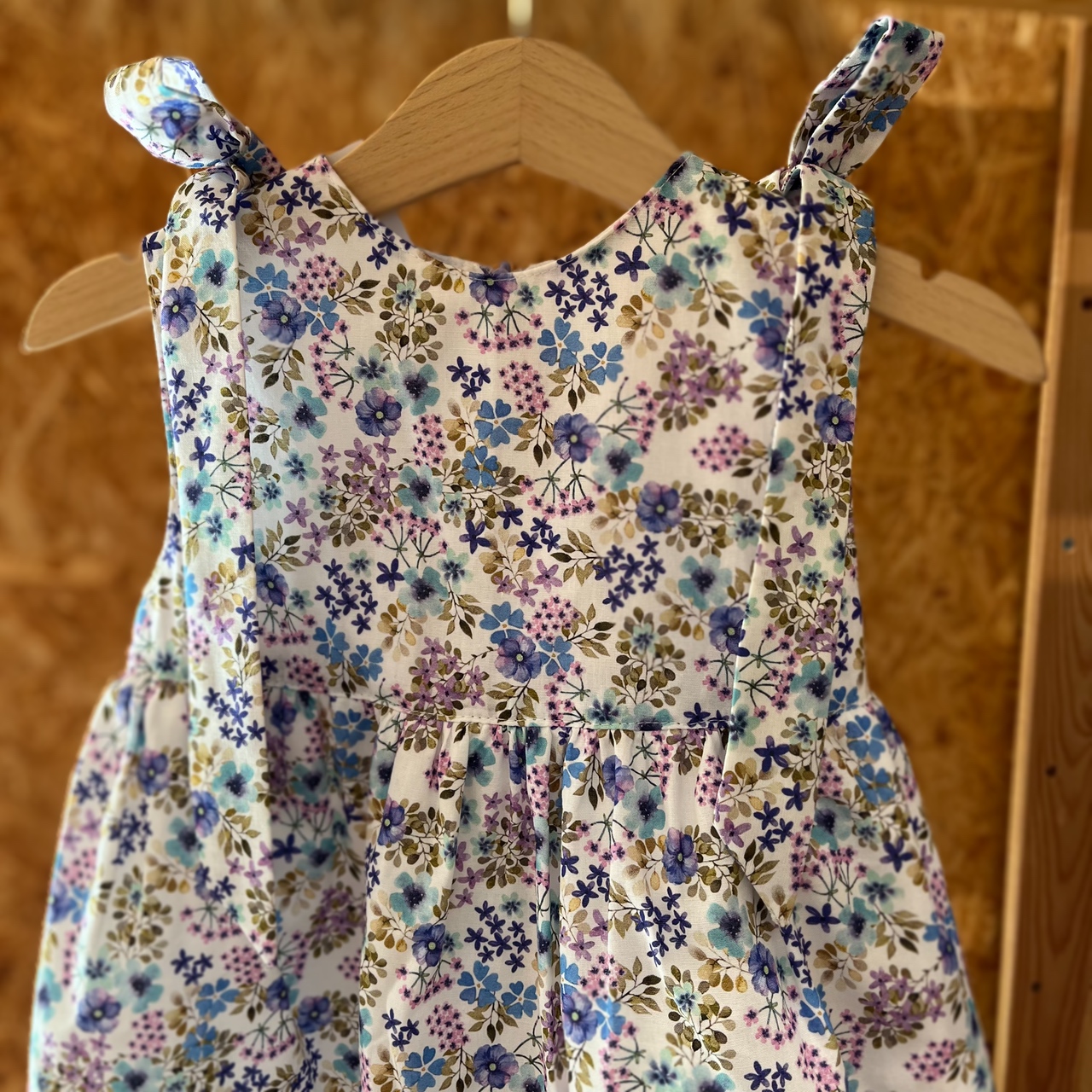 • Vestido infantil floral azul, roxo e verde com alças num cabide de madeira