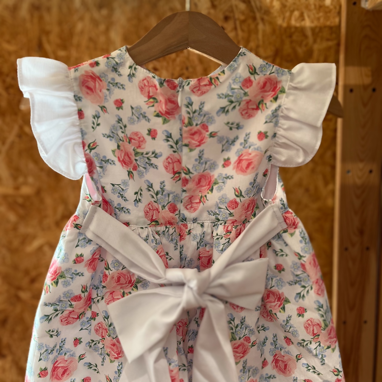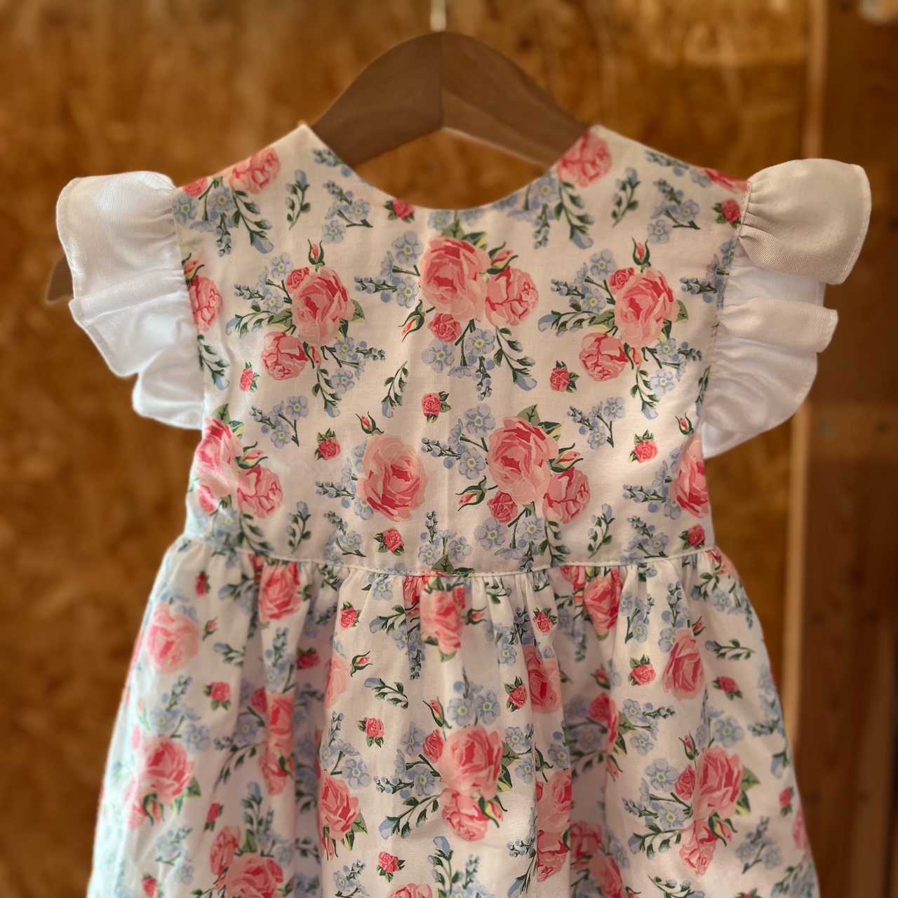 • Vestido infantil branco com padrão de rosas cor-de-rosa e folhas verdes, mangas bufantes brancas, pendurado em cabide de madeira.