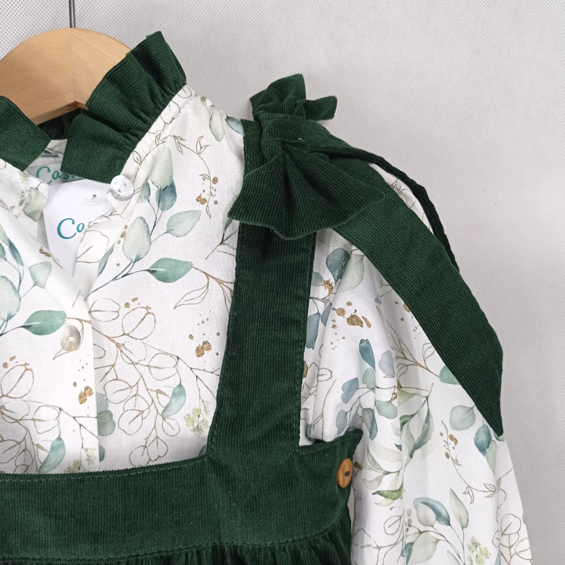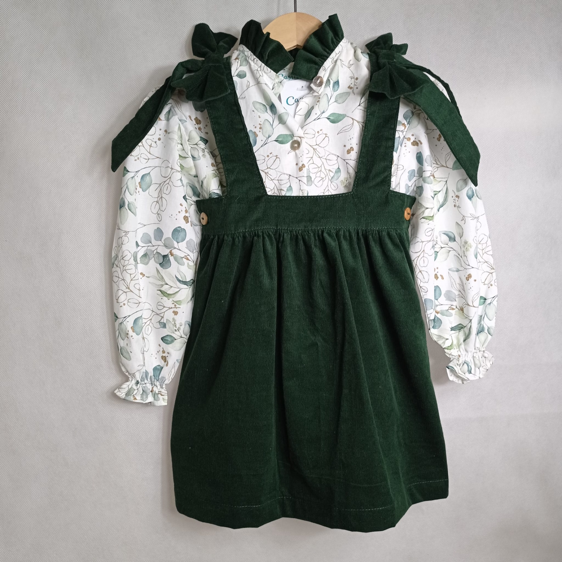 • Conjunto infantil blusa floral branca e avental verde escuro com laço