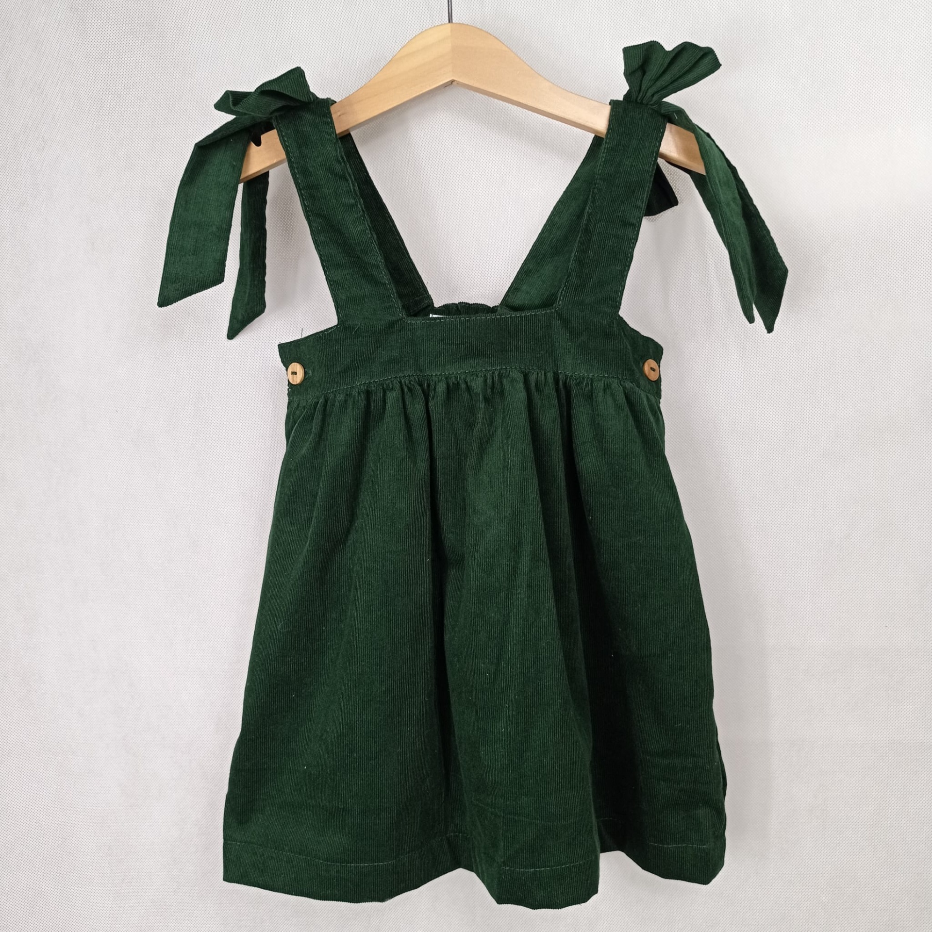 • Vestido verde escuro com alças de laço pendurado em cabide de madeira